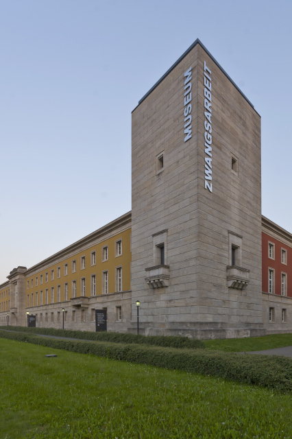Auftakt, Bild: Michael Miltzow Das Museum Zwangsarbeit im Nationalsozialismus wurde im Haus 1 des Thüringer Landesverwaltungsamtes in Weimar eröffnet. Die von der Behörde ungenutzten Räume des ehemaligen Kinosaals erwiesen sich als idealer Rahmen für die Einrichtung der Ausstellung. Einerseits bieten sie die notwendigen Flächen, um die bislang als Wanderausstellung im deutschsprachigen Europa gastierende Sammlung zu präsentieren. Andererseits wird mit der Verortung im ehemaligen Gauforum daran erinnert, dass beim Bau ebendieses Gebäudekomplexes Zwangsarbeit ausgenutzt wurde. Neben der Ausstellung wurden Seminarräume, Flächen für Sonderausstellungen und ein Foyer eingeordnet. Ein Aufzug erschließt alle Ebenen barrierefrei. Die Sicherheitsbelange der Landesbehörde waren zu beachten.