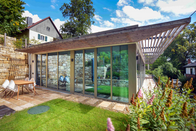 Ansicht - Terrassenseite, Bild: Claus Bach Das neue Wohnhaus schiebt sich mit seiner Nordostfassade vollständig in den Hang. Die Erschließung erfolgt über einen überdachten Freibereich im Erdgeschoss. Eine einläufige Sichtbetontreppe erschließt den Wohnbereich im Obergeschoss. Der tragenden Struktur des Wohnhauses aus Sichtbetonwänden steht eine großzügige Belichtung der Wohnräume über raumhohe Holzfensterelemente gegenüber. Als Sonnenschutz dienen horizontal verlaufende Lamellen aus Lärchenholz. Das Gründach mit extensiver Begrünung bildet den oberen Abschluss des Gebäudes und bindet es in den bestehenden Hang ein. Den Wohnräumen vorgelagert sind ein nach Südwesten ausgerichteter Balkon sowie eine Terrasse, die sich nordwestlich des Gebäudes in den Hang schiebt und mit Natursteinelementen gestaltet ist.