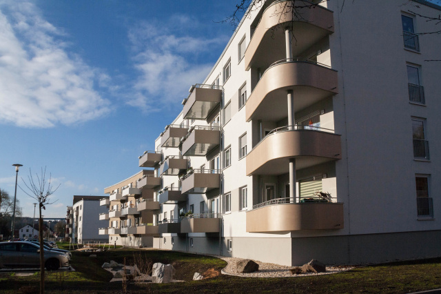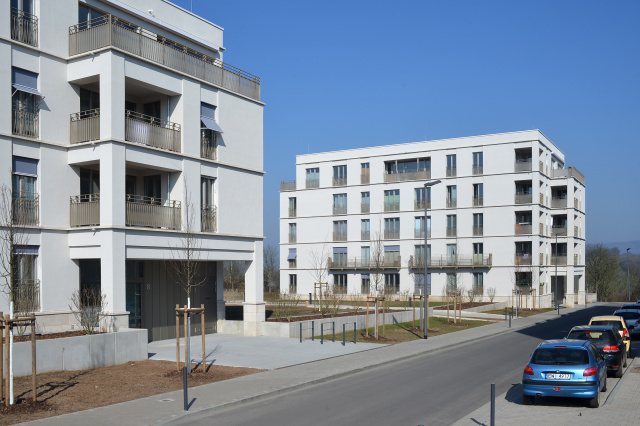 Südosten, Bild: Jens Lönnecker Die Aufgabe beinhaltete die qualitätsvolle Ersatzbebauung eines bereits existierenden Wohnstandortes. Die neuen Gebäude orientieren sich in ihrer Basis am Gründungskörper der Ursprungsbebauung, nehmen jedoch in ihrem städtebaulichen Ansatz auf die geschwungene Form der Flussaue Bezug. So weisen die aufgehenden Etagen konvexe und konkave Fassadenformen auf. Die lang gestreckte, blockartige Anmutung der Ursprungsbebauung wird durch die Anordnung von Gebäudefugen und unterschiedlichen Geschossanzahlen aufgelöst. Alle 36 Wohnungen wurden unmittelbar nach Fertigstellung des ersten Bauabschnittes bezogen, dem im Jahr 2017 ein weiteres Gebäude folgen wird.