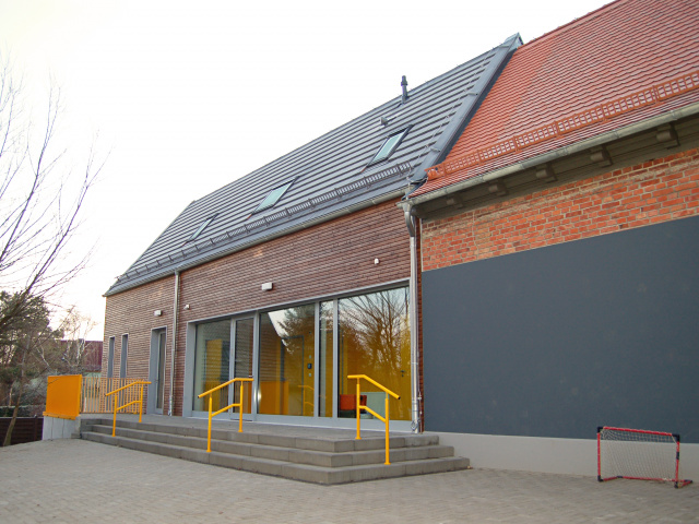 Haupteingang, Bild: Nadine Stevens Die Abmessungen und gravierende Schäden in der Bausubstanz der Bestandshalle führten zum Neubau. Dieser dient mit einer Hallenfläche von 20 mal 30 Meter und einem Mehrzweckraum von 100 Quadratmeter dem Schul- und Breitensport. Eine Hallentrennung ermöglicht die parallele Nutzung durch zwei Klassen. Das Tragwerk der Halle bilden Stahlbetonstützen und Leimholzbinder. Schallabsorbierende Trapezbleche und die Installationen sind frei sichtbar. Fensterbänder auf beiden Längsseiten und dimmbare LED-Leuchten dienen der Belichtung. Deckenstrahlplatten, ein flächenelastischer Sportboden, eine textilbespannte Prallwand, Akustikplatten und nicht zuletzt die Sportgeräte vervollständigen die Halle. Die neue Brücke über den Rosenbach verbessert neben der Erschließung der Halle auch das Wegenetz der Stadt Ellrich.