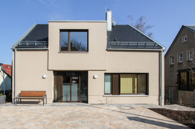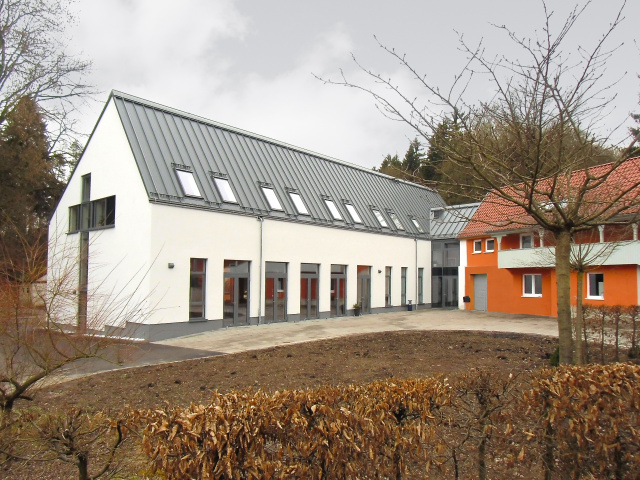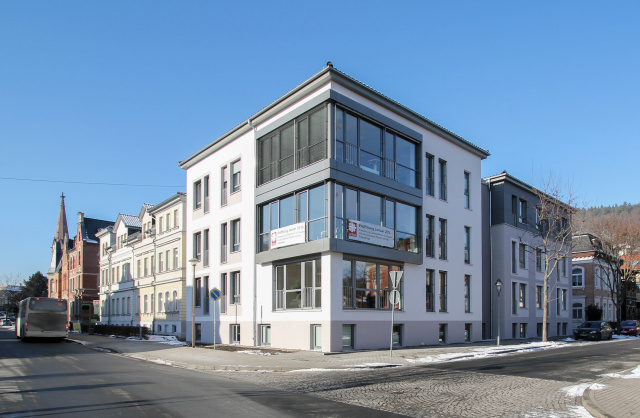Südostansicht, Bild: Lars Jugel Im Villenviertel von Rudolstadt entstand der Ersatzneubau als Eckbebauung. Er erweitert das Altenpflegezentrum „St. Elisabeth Haus“ um 26 Bewohnerzimmer. Je acht bis neun Einzelzimmer bilden eine Wohngruppe mit großzügigem Wohn- und Aufenthaltsbereich. Der verglaste Erker gibt den Blick auf die umliegenden Gründerzeitvillen und die Heidecksburg frei. Der Neubau ist in den oberen Geschossen über einen Verbinder mit dem Altbau des Altenpflegezentrums verbunden. Im Untergeschoss wurde eine Tagesbetreuung für 15 Gäste konzipiert, die über den Haupteingang des Neubaus erschlossen wird. Die am Giebel liegende Terrasse kann durch bodentiefe Verglasungen vom Aufenthaltsbereich aus erlebt werden. Die Genehmigungsplanung erfolgte durch Dr.-Ing. Roland Gutjahr, die Ausführungsplanung bis zur Realisierung durch Hauschild-Architekten.