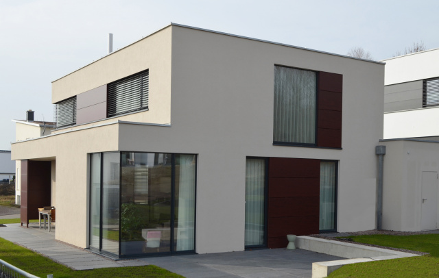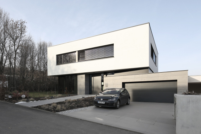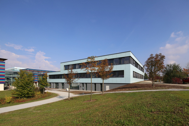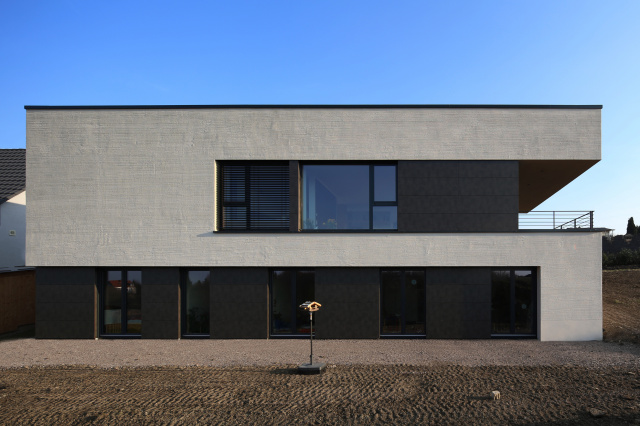 Südansicht, Bild: Matthias Schmidt Für die TMP Fenster + Türen GmbH in Bad Langensalza sollte ein modernes Verwaltungs- und Ausstellungsgebäude entworfen werden. Durch das leicht ansteigende Gelände konnte das Gebäude in drei Funktionsbereiche gegliedert werden. Straßenseitig ist der Showroom einem Empfangsbereich vorgeschaltet, eine Treppe führt auf eine Zwischenebene mit den halböffentlichen Geschäftsführer- und Beratungsräumen. Im Obergeschoss befinden sich Büros und ein Pausenraum. Die durch Glaswände getrennten, großzügig wirkenden Arbeitsbereiche gruppieren sich um einen begrünten Innenhof und ermöglichen so unterschiedlichste Ein- und Durchblicke. Markantes Element innerhalb der Fassade aus Glasfaserbetonplatten ist die nach Süden orientierte und durch Verschattungsschwerter gegliederte Fensterfront im Obergeschoss.