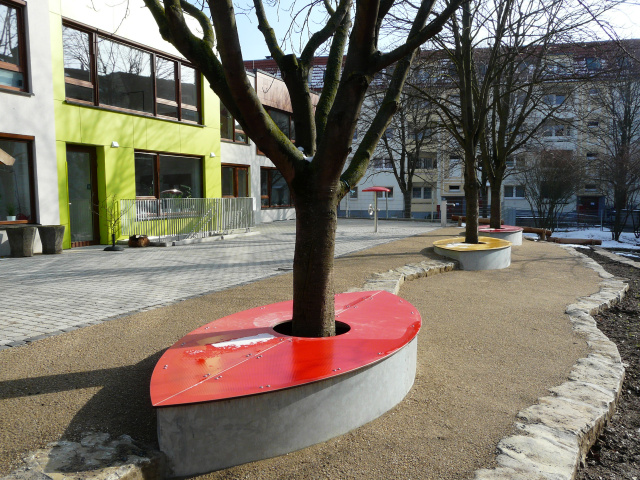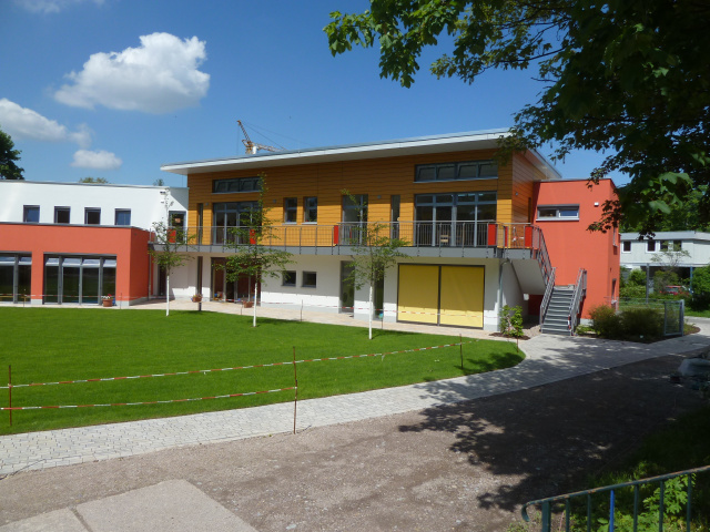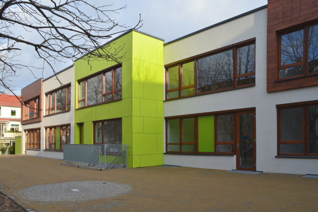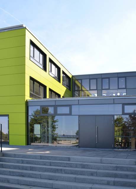 Gemeinschaftsschule Sanierung, Bild: Frank Sieber Die energetische Sanierung und Neugestaltung des Schulgebäudes nimmt durch Formulierung einer klaren Linie als Gestaltungsthema Bezug auf den Plattenbaubestand. Die Planungen umfassten unter anderem die Erneuerung der Gebäudetechnik, Wärmeschutz- und Brandschutzmaßnahmen sowie die Außenanlagen. Zusätzliche Unterrichtsräume wurden eingefügt und durch eine neue Erschließungszone ergänzt. Für den Ganztagsschulbetrieb wurden Aula, Küche und Speisesaal neu gestaltet. Hinzu kamen die Verlegung des Sanitärbereichs sowie der barrierefreie Ausbau mit Aufzugsanlage. Im Ergebnis sollen klare kubische Baukörper deutlich herausgearbeitet und betont werden, unterstützt durch sorgfältige Ausbildung der Details und ein frisches Farbkonzept. Übersichtlichkeit, Transparenz und kurze Wege prägen das Erscheinungsbild.