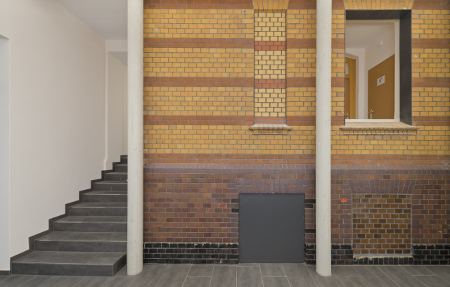 Ehemalige Außenwand Erdgeschoss, Bild: Michael Miltzow, Bildwerk Fotodesign Der Sitz der Wohnungsgesellschaft Apolda befindet sich im ehemaligen Hafthaus des Amtsgerichts. Das 1881 fertiggestellte Bauwerk gehört zum Gebäudeensemble Gerichtsgebäude, Hafthaus und Freigangmauern und steht unter Denkmalschutz. Es ordnet sich einer starken symmetrischen Gliederung unter und wird durch die mit gelblichem Klinker verkleideten Außenmauern sowie rötliche Klinkerbänder geprägt. Denkmalpflegerische Zielstellung war die Aufrechterhaltung der historischen Gebäudestruktur. Der Neubau orientiert sich an der vorgefundenen Symmetrie, hebt sich in der Fassadengestaltung jedoch bewusst vom Bestand ab. Die Klinkerfassade der westlichen Außenwand wird im Innenraum erlebbar und markiert den Übergang von Alt zu Neu. Der Anbau beherbergt einen öffentlichen Bereich für Wohnungsmieter im Erdgeschoss sowie Büroräume in den oberen Etagen.