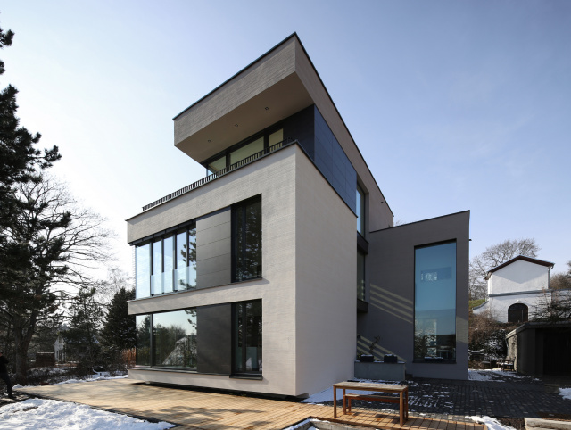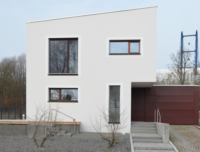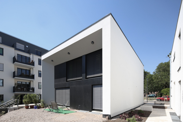 Südwestansicht, Bild: Tom Nabrotzky Lange prägte ein leeres, baufälliges Wohngebäude aus dem Jahr 1918 das Bild des Amselwegs. Nach seinem Abriss steht an gleicher Stelle ein neuer, moderner Gebäudekomplex mit sieben Wohnungen in Reihenhausstruktur. Die sechs dreigeschossigen Regelwohnungen mit circa 120 Quadratmeter Wohnfläche verfügen über je vier Zimmer, eine großzügige Küche mit Essbereich, zwei Bäder und einen Abstellraum. Eine mit circa 117 Quadratmeter kompakter geschnittene, zweigeschossige Wohnung auf der östlichen Gebäudeseite umfasst drei Wohnräume, Bad und Abstellraum. Der Koch- und Essbereich wurde in den großen, offen gestalteten Wohnbereich integriert. Durch kleine Vorgärten gelangt man zu den Hauszugängen auf der Südseite des Gebäudes. Die auf der Nordseite entstehenden Terrassen bieten den Mietern eine ansprechende, gartenähnliche Atmosphäre.