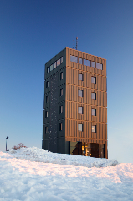 Blick auf die Eingangsseite, Bild: Axel Bauer „Architektur für alle“ – unter diesem Motto präsentiert sich der sanierte Fernmeldeturm, welcher nach fast 60 Jahren militärischer Nutzung im Jahr 2015 erstmals der Öffentlichkeit zugänglich wurde. Bereits im ersten Betriebsjahr konnten im Turm über 40.000 Besucher begrüßt werden. Mit der Sanierung wurde auf Thüringens markantestem Berggipfel ein technisches Bauwerk gesichert und somit in eine bestimmte Zukunft überführt. Durch neu eingebaute, großzügige Verglasungen öffnet sich der Turm zum angrenzenden Rennsteig. Hier betritt der Besucher das Foyer und anschließend die fünf oberirdischen Geschosse. Im obersten Geschoss auf circa 931 Meter Höhe erwartet ihn ein 360-Grad-Rundumblick über den Thüringer Wald bis hin ins Thüringer Becken.
