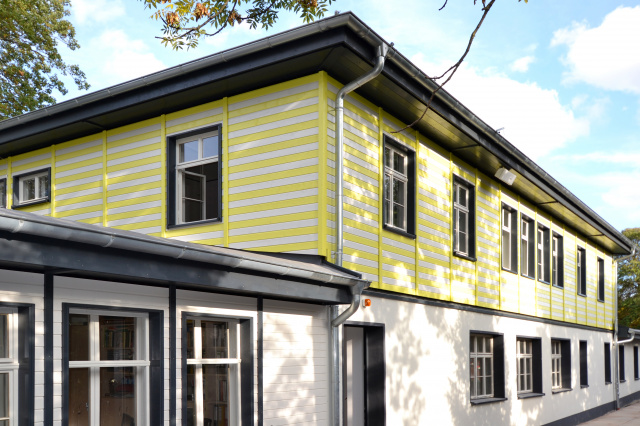 Neubau Schulpavillons, Bild: Alexander Burzik Die Neubauten des Schulgeländes in Rudolstadt-Schwarza wurden in Holzbauweise errichtet. Mit Durchblicken ins Tal ergänzen sie den auf der Anhöhe gelegenen Schulcampus. Die Grundrisse der beiden Schulpavillons laden zum Verweilen ein und gliedern den Außenbereich. Je vier Klassenräume werden durch zwei Differenzierungs- und Kursräume funktional verbunden, wodurch auch jahrgangsübergreifender Unterricht ermöglicht wird. Die Errichtung der Schwarzaturnhalle als Einfeldsporthalle für den Sportunterricht sowie für die Nutzung durch regionale Sportvereine komplettiert den Schulcampus. Die Halle ist zusätzlich teilbar, sodass auch geschlechtergetrennter Sportunterricht möglich ist. Die ehemalige Turnhalle wurde saniert und zur multifunktionalen Aula und Mensa umgebaut.