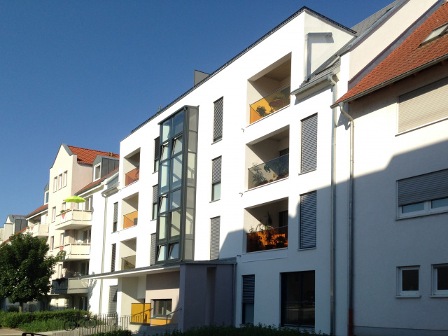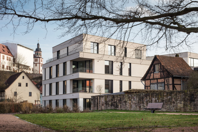 Ansicht vom Park, Bild: Tino Sieland Die ruhige Wohnlage, etwas abseits vom Stadttrubel und doch in nächster Nähe zum Zentrum von Schmalkalden, lässt kaum Wünsche offen. Man genießt die fußläufige Nähe zu Lutherplatz, Salzbrücke und Altmarkt, den Anschluss zum städtischen Grüngürtel, die historische Nachbarschaft und die Aussicht zum Schloss Wilhelmsburg. Der gemeinsame private Innenhof schafft Distanz zum Öffentlichen und bietet einen Begegnungsraum für die Bewohner. Es entstanden 15 barrierefreie Eigentumswohnungen mit Tiefgaragenstellplatz, Loggia oder Terrasse und großzügigen Grundrissen von 93 bis 133 Quadratmeter. Die klare Anordnung der Gebäude mit einem „Haus zur Stadt“ und einem „Haus am Park“ mit den gut besonnten Terrassen, Loggien und Sitzplätzen ermöglicht ein zentrumsnahes Wohnen mit viel Licht und privatem Freiraum.