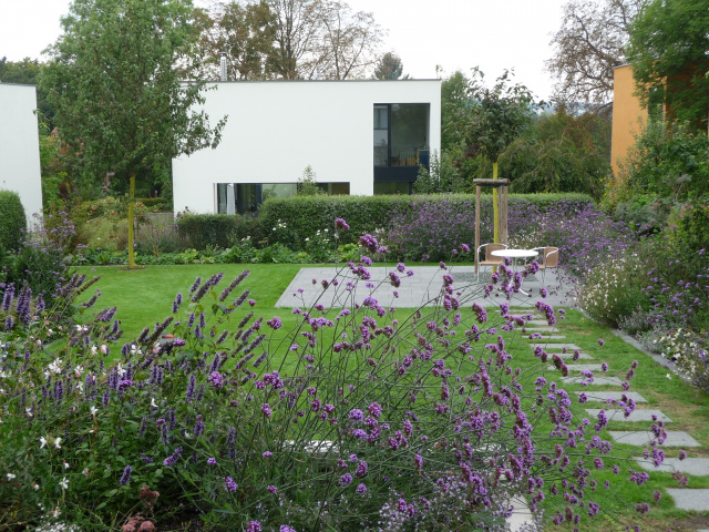 Gartenblick im August, Bild: Martina Trebert Mit der Fertigstellung des Wohnhauses im Jahr 2006 wurde der Garten in seinen Grundzügen, wie Hauseingang, Terrasse und einer reduzierten Bepflanzung, angelegt. Mit der Gartengestaltung wurde der Gartenraum definiert. Eine Sichtschutzwand verändert die Eingangssituation, trennt den öffentlichen vom privaten Raum und schafft mit den neu gepflanzten Hecken und Bäumen mehr Intimität im Garten. Stauden und Gräser, vor allem im neuen Hochbeet an der Hausterrasse und im Garten, sind heitere Gegenspieler zum modern schlichten Haus. Die automatisierte Bewässerung von Rasen und Pflanzflächen reduziert den notwendigen Pflegeaufwand und erhöht den Gartenkomfort.