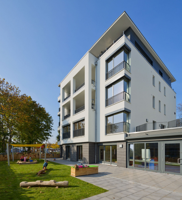 Kindergarten mit Wohnungen, Bild: Michael Miltzow Im Brühl, einem ehemals industriell genutzten Gebiet, entwickelt die Landesentwicklungsgesellschaft einen neuen Stadtteil. Um auch soziale Aspekte zu berücksichtigen, wurde die Idee einer Betriebs-Kita geboren. Es entstand eine zweigeschossige Kindertagestätte für 120 Kinder. Darüber befinden sich zehn Eigentumswohnungen im Standard KfW-Effizienzhaus 40. Das Gebäude besitzt eine Tiefgarage mit zwölf Stellplätzen. Der Krippenbereich im Erdgeschoss verfügt über einen direkten Zugang zu den Spielflächen, der darüberliegende Bereich über eine Dachterrasse. Eine große Spielfläche wurde aufgrund der beengten Situation seitlich des Gebäudes vorgesehen. Die äußere Gestalt des Hauses richtet sich nach den strikten Vorgaben des Bebauungsplans. Das Dachgeschoss wurde mit Fassadenpaneelen, das Erdgeschoss mit Keramikverblendung verkleidet. Im Gebäude wurden Fenster aus Holz mit außenliegendem Sonnenschutz als Raffstore verwendet.