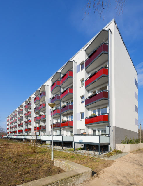 Balkonsanierung und -erweiterung Häuser 18 bis 25, Bild: Michael Miltzow Die Liegenschaft Jakob-Kaiser-Ring 14 bis 54 liegt im Norden Erfurts im Stadtteil Roter Berg. Der Rote Berg ist ein „Plattenbaugebiet“, das in den Jahren 1978 bis 1981 durch das Wohnungsbaukombinat Erfurt erstellt wurde. Das Areal war zu seiner Errichtung aufgrund seiner städtebaulichen Anlage mit den vier autarken Ringen und der zentralen Grün- und der quer dazu verlaufenden Versorgungsachse eine Besonderheit in der Plattenbaugeschichte der DDR. Das Wohngebiet soll in einem der Wohnungsbau-Genossenschaft „Erfurt“ entsprechenden höheren Standard entwickelt werden. Das Ziel ist, gut vermietbare Wohnhäuser mit „gesunder“ Mieterstruktur jeder Altersgruppe zu gewährleisten bzw. zu bewahren. Besonderes Augenmerk wurde dabei auf eine barrierefreie Erschließung des Erdgeschosses, auf eine sinnvolle energetische Sanierung der Gebäudehülle und die komplette Neugestaltung der Außenbereiche gelegt.