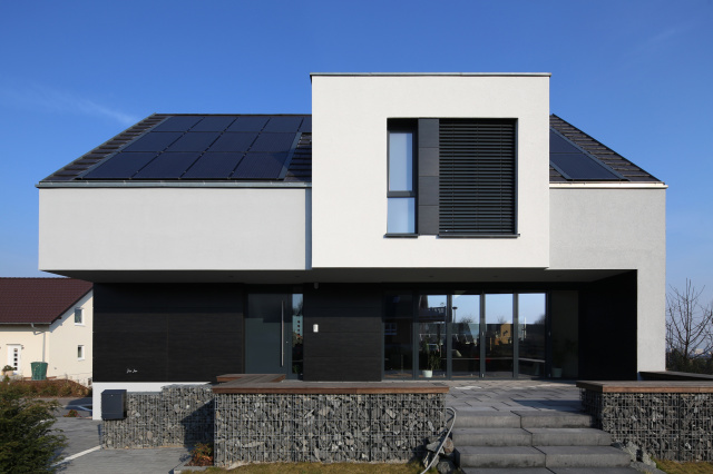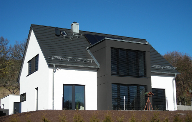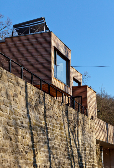 Südansicht, Bild: Christian Kaiser Ziel war es, eine freie Form als Antwort auf die größtenteils monotone Architektur der Marbacher Baugebiete zu finden. Die Funktionen im Inneren - abgestimmt auf die Bedürfnisse der Eigentümer und den Möglichkeiten der örtlichen Lage - prägten dabei die Grundideen. Dabei war es vor allem der fantastische Stadtblick, der immer wieder inszeniert wurde. Nachteilige Grundstückssituationen wurden zum Vorteil umgekehrt. Der Wohnbereich im Erdgeschoss wurde offen und großzügig gestaltet und lässt sich durch eine Faltanlage nach außen erweitern. Zentrales Element ist die in der Galerie freistehende Treppe. Das Wohnkonzept wurde perfekt auf die Nutzer abgestimmt, Bäder wurden individuell gestaltet, Einbaumöbel entworfen. Materialien wurden auf immer wiederkehrende Themen reduziert. Die Gebäudehülle ist optimal gedämmt. Wärmepumpe und Lüftungsanlage runden das Energiekonzept ab. Um den Strombedarf zum Teil selbst abzudecken, wurde eine Photovoltaikanlage in die Dachfläche integriert.