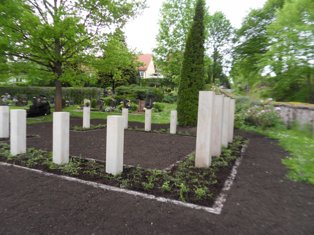 Fertigstellung vor Rasenansaat, Bild: Steffen Möbius Die bisherige Darstellung der Gedenkanlage nahm keinen Bezug auf die hier bestatteten zehn ukrainischen Kinder im Alter von null bis vier Jahren sowie vier erwachsenen Zwangsarbeiter, die 1943 aus ihrer Heimat zur Arbeit in den Gustloff-Werken nach Suhl verschleppt wurden. Aufgrund des baulichen Zustandes musste der nach Befehl der sowjetischen Militäradministration 1947 errichtete Obelisk abgerissen werden. Mit der Neugestaltung der Anlage soll vor allem auf den Tod der Kinder hingewiesen werden. Auf dem Grundriss der alten Anlage wurden quadratische Stelen aus hellen Kalkstein eingeordnet. Mit der Wahl des hellen Weichgesteins soll die Unschuld und Zerbrechlichkeit der hier bestatteten Menschen verdeutlicht werden. Durch die nach innen gerichtete Beschriftung muss der Besucher in die Mitte der Anlage treten. Hier wird er umringt von den vier Erwachsenen und zehn Kindern, deren Namen und Daten ihres kurzen Lebens zu Gedenken und Mahnung auffordern: „Nie wieder Krieg – haltet Frieden!“