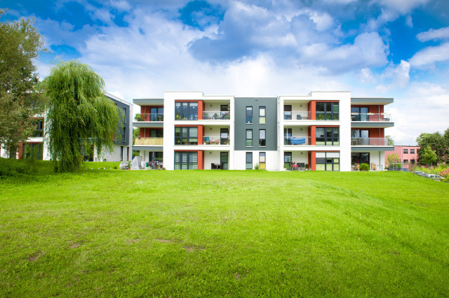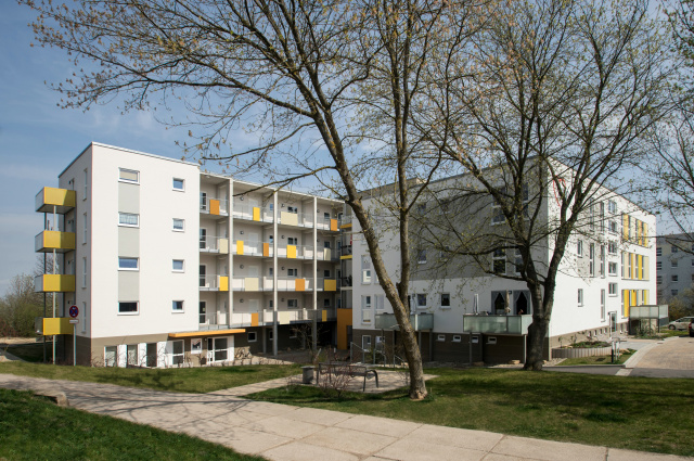 Ansicht bei Nacht, Bild: Christoph Beer Bei dem Geschosswohnungsbau handelt es sich um einen dreigliedrigen Baukörper mit einer funktionalen Verbindung über Laubengänge in allen Geschossen. Das Kellergeschoss ist baulich und funktional miteinander verbunden. Die interne Erschließung aller Gebäudeteile erfolgt über außen liegende, nach Osten bzw. Norden ausgerichtete Laubengänge. Über neu geplante Aufzüge ist der barrierefreie Zugang zu allen Wohnungen sowie der Abstellbereiche im Kellergeschoss möglich. Mit dem Bauvorhaben wurden Eineinhalb-, Zwei- und Dreiraumwohnungen realisiert. Mehrere Wohnungen sind barrierefrei. Zusätzlich zu den 51 Wohnungen entstehen im Bauteil C eine Begegnungsstätte mit einem angegliederten Pflegebad und eine Gästewohnung. Alle Wohneinheiten wurden mit einer Loggia bzw. einem Balkon ausgestattet, der ebenfalls barrierefrei begangen werden kann.