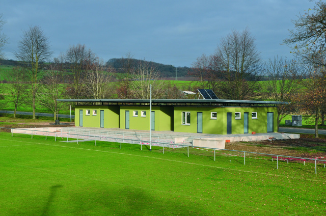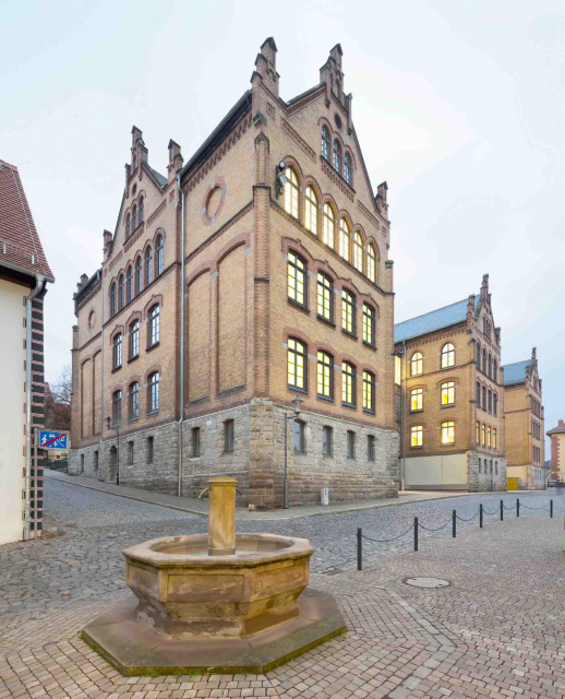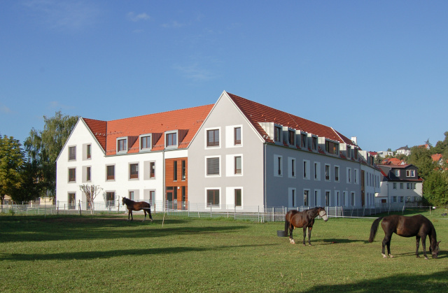 Südwestansicht, Bild: Jens Lönnecker Suhl stellt eine der am schnellsten alternden Kommunen in Thüringen dar. Infolge fehlender Kinder besteht das Erfordernis, vorhandene Schulnetzkonzeptionen kurzfristig fortzuschreiben. Das führt zu Schulschließungen wie 2008 im ländlichen Stadtteil Goldlauter-Heidersbach. Die vormalige, sich exakt im Ortsteilzentrum befindende Grundschule versank in einen fünfjährigen Dornröschenschlaf. Die intakte Infrastruktur und das solide Plattenbauobjekt wurden bewertet und flossen in die Entwicklung eines Nachnutzungskonzeptes ein. Dabei erwies sich die Verwendung vorhandener Substanz als ökologisch nachhaltig und wirtschaftlich sinnvoll. Nach Baubeginn im Frühjahr 2013 erfolgte die Übergabe im Sommer 2014. Im Ergebnis entstanden acht Wohnungen im Sinne der DIN 18040 Teil 2, zwei ambulant betreute Wohngruppen für je acht Bewohner mit zugehöriger Funktionsstruktur sowie vier Mietwohnungen im Nordflügel. Eine Begegnungsstätte rundet das Angebot ab. Das Vorhaben versteht sich als Beispielprojekt zur Nachnutzung kommunaler Liegenschaften.