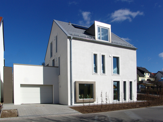 Südfassade, Bild: Stefan Martin Das auf einem Eckgrundstück im Taubacher Wohngebiet „An der Schatzgrube“ gelegene Gebäude bietet den Bewohnern auf drei Etagen viel Wohnraum. Im Erdgeschoss sind vor allem Wohn- und Essbereiche untergebracht, in den Obergeschossen private Funktionen wie Schlaf-, Arbeits- und Gästezimmer. Stehende Fensterformate betonen, der exponierten und prägnanten Ecklage des Gebäudes angemessen, die Vertikalität des Gebäudes. Ein Eingangsbauwerk nimmt spielerisch widerspiegelnd die Umgebung auf, adressiert den Haupteingang und bietet zugleich Schutz vor Blicken von der Straße aus. Die mit einem Strukturputz und Fensterfaschen versehene und in Weißtönen gehaltene Fassade gibt dem Bau - im Zusammenspiel mit der hellgrauen Dachdeckung - eine reduzierte Farbigkeit und eine nuancierte Plastizität. Das Haus verfügt über einen nicht einsehbaren Innenhof mit kleinem Wasserbecken sowie eine Dachterrasse und wird dreiseitig von Grünflächen umschlossen.