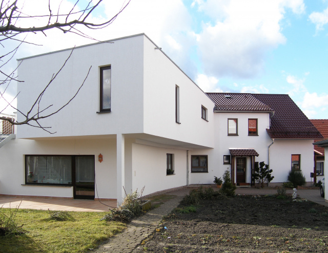 Hofansicht, Bild: Rüdiger Weingart Das Grundstück befindet sich im Ortszentrum, nicht weit von der Kirche entfernt. Das Wohngebäude besteht aus einem Haupthaus und einem erdgeschossigen Anbau. Im Erdgeschoss wohnen die Senioren und im Dachgeschoss die junge Familie. Das Dachgeschoss sollte erweitert werden. Dafür wurde das Dach des Anbaus abgebrochen und ein Erweiterungsbaukörper aufgesetzt. Der bestehende Anbau besitzt eine sehr unregelmäßige Grundrissform, auf die in der Planung reagiert wurde. Der neue Baukörper wurde in Form einer Box so auf dem Anbau platziert, dass dreiseitig ein Überstand und auf einer Seite eine Terrasse entstanden. Die Terrasse ist vom Wohnbereich zugänglich und besitzt eine Treppe, die in den rückwärtigen Gartenbereich führt. Die neu geschaffenen Wohnräume werden direkt über die Diele im Obergeschoss von der bestehenden Wohnfläche erreicht. Um alle konstruktiven und statischen Aufgaben lösen zu können, wurde die Box in Holzrahmenbauweise mit einer oberen und unteren Holzbalkendecke errichtet.