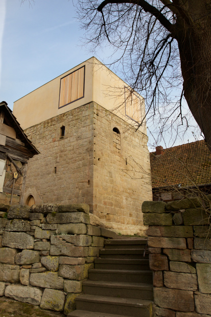 Straßenansicht von Westen, Bild: Axel Bauer „Architektur hat Bestand“ - unter diesem Motto präsentiert sich der sanierte Wehrturm aus dem zwölften Jahrhundert mit der neuen Sichtbetonaufstockung als Aussichtsgeschoss. Die kleine romanische Burganlage in Volkerode befindet sich auf einem höher gelegenen Sandsteinfelsen in Dorfmitte. Zur Anlage gehören ein Wehrturm, ein Herrenhaus sowie ein Backhaus, umgeben von einer Ringmauer. Der Wehrturm war in schlechtem Zustand und wurde nun statisch gesichert, konserviert und restauriert. Zum funktionalen und konstruktiven Abschluss des Wehrturmes wurde ein neues Dachgeschoss als Aussichts- und Lüftungsgeschoss auf den Natursteinmauern errichtet. Die Aufstockung ist als archaisch wirkender, glatt geschalter Sichtbetonkubus mit geneigten Dachflächen hergestellt. Große Öffnungen, welche mit Holzklappschiebeelementen verschlossen sind, dienen zur Be- und Entlüftung und bieten einen Ausblick in die umgebende Landschaft bis hin zum Höhenzug Gobert. Alle weiteren „neuen Zutaten“ wie Treppen und Fenster bestehen aus unbehandeltem Stahl.