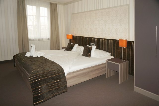Mastersuite, Bild: Gisbert Bachrodt Das Vier-Sterne-Superior-Hotel, einstiges Anwesen des Rittmeisters Carl von Kalckreuth, liegt idyllisch im eigenen Park. Es gehört in die Gruppe der Romantikhotels und wurde entsprechend neu ausgestattet. Die Hauptaufgabe bestand darin, die Zielgruppe der „Romantiker“ zu definieren und das Hotel mit der gekrönten Küche des Hauses zu verschmelzen. Die Strukturen und Gliederungen des Gebäudes wurden angenommen und im Sinne der Gutsarchitektur überarbeitet. Alle Zimmer verfügen über einen zeitgemäßen Ausstattungsstandard. Die Möbel, die speziell für das Hotel entworfen wurden, orientieren sich an klassischen Formen und dienen als „ruhiges“ Mobiliar, um die Architektur mit ihren Stuckleisten und die üppigen Wandbeläge zur Geltung kommen zu lassen. Akzente wurden im Bereich der Sitzmöbel gesetzt: Hier sind aufwendig verarbeitete, schwere Stoffe mit Goldeinwebung zum Einsatz gekommen. Die Farbigkeit der Innenausstattung orientiert sich - in Kontrast zur grünen Parklandschaft - an erdigen Farbtönen.