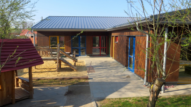 Der Bau erfolgte mit Mitteln aus dem Investitionsprogramm des Bundes „Kinderbetreuungsfinanzierung 2013-2014“. Der Kindergarten wurde zweigeschossig mit ausgebautem Satteldach konzipiert und verfügt über eine Holzpelletheizung sowie eine Lüftungsanlage mit Wärmerückgewinnung. Eine Photovoltaikanlage hilft, die Betriebskosten zu minimieren. Die Vorgaben der Energieeinsparverordnung werden um circa 40 Prozent unterschritten. Im Erdgeschoss ist Platz für zwei Gruppen zu je zehn Kindern bis drei Jahre. Im Obergeschoss sind insgesamt 30 Plätze für größere Kindergartenkinder vorhanden. Es stehen fünf Funktionsräume für Bauen, Bewegen, Kreativität, Rollenspiel und das Kinderrestaurant zur Verfügung. Eine vorgesetzte Balkonanlage ermöglicht den direkten Zugang aus den oberen Gruppenräumen in den Außenbereich und dient zugleich als zweiter Rettungsweg. Während die Innenräume des Gebäudes teilweise auch mit intensiven Farbflächen gestaltet sind, wurde die Fassade in großen Bereichen mit einer unbehandelten Lärchenholzverkleidung versehen.