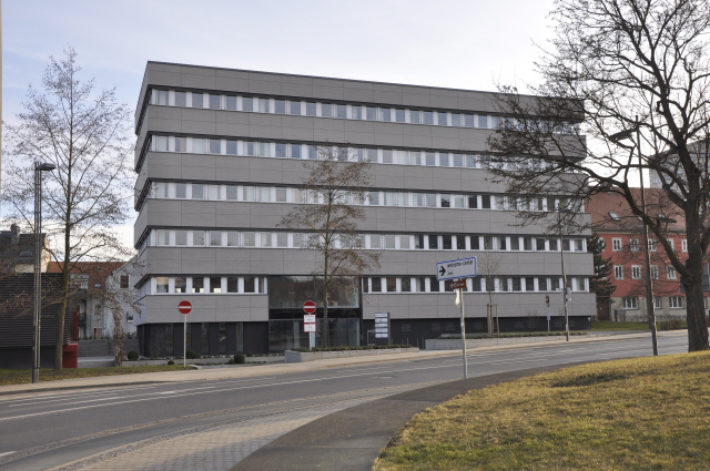 Ansicht Friedensstraße, Bild: Klaus Reich Das „Mehrzweckgebäude Friedensstraße 42“ ist ein zu Beginn der 1980er Jahre erstellter, fünfgeschossiger Stahlbeton-Fertigteilbau. Das Gebäude wurde in den 1990er Jahren durch Aufbringen eines Wärmedämmverbundsystems energetisch ertüchtigt. Nun wurde die Erschließung des Grundstücks und des Gebäudes im Zusammenhang mit dem bereits errichteten „Parkdeck Friedensstraße 42“ überarbeitet: Nach Abbruch der vorgestellten Treppenanlage und behutsamer Geländemodellierung wurde der Haupteingang ins Untergeschoss verlegt. Von hier erreicht man über das neu geschaffene Foyer einen Aufzug sowie das Sicherheitstreppenhaus. Die Eingriffe dienten der Anpassung an aktuelle Vorgaben des Brandschutzes sowie der Verbesserung des Komforts und der Barrierefreiheit. Das Gebäude wird unverändert als Mehrzweckgebäude genutzt. Neben der Verwaltung des Wasserversorgungszweckverbandes befinden sich die Regionalverwaltung 9 der BAD GmbH sowie andere Einrichtungen und Praxen des Gesundheitswesens im Gebäude.