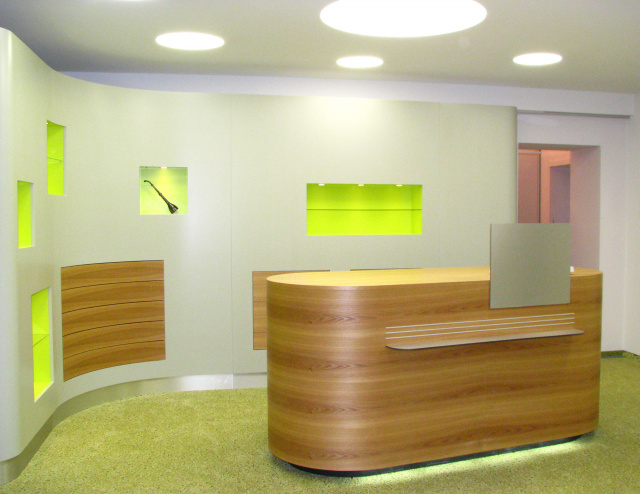Beratungs- und Verkaufsbereich, Bild: Jutta Kehr Der kleine Hörgeräteshop aus den 90er Jahren war in die Jahre gekommen. Ein neues zeitgemäßes Konzept mit maßvollen Umbaueingrifffen war zu entwickeln. Wir hatten die Gratwanderung zwischen moderner zukunftsorientierter Ausstrahlung und den Ansprüchen der überwiegend älteren Kundschaft zu meistern. Da alle Funktionsbereiche für den schnellen Service am Kunden ineinander greifen sollten, haben wir als harmonisierende Basis den eigenwilligen gelbgrünen Teppich und warme Grautöne für Wände und Funktionsmöbel …