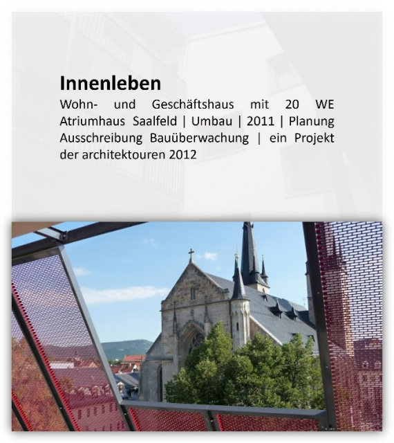 Innenleben, Bild: Katja Huhle Atriumhaus Saalfeld - Umbau zu Wohn- und Geschäftshaus mit 20 WE Planung, Ausschreibung, Bauüberwachung Das fünfgeschossige Atriumhaus, Teil der geschlossenen Bebauung der historischen Kernstadt, wurde in den Obergeschossen zu 20 barrierefreien Wohnungen sowie zu Läden im Erdgeschoss umgebaut. Mit der (Wieder-) Öffnung des Atriums zum Himmel, zum Treppenhaus und den Laubengängen wurden die Ur-Ideen des Baues von 1986 wiederbelebt und stärker ausgearbeitet. Im Vordergrund standen freiere Grundrisse …