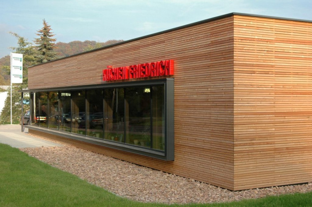 Ansicht Straße, Bild: Michael Heß „Architektur belebt“ Unter diesem Motto steht auch der Neubau des Küchenfachgeschäftes Friedrich in Thal, welcher dem etablierten Unternehmen eine Steigerung der Kundenzahlen und zusätzliche Auftragseingänge bescherte. Errichtet als vorgefertigter eingeschossiger Holzrahmenbau mit Brettschichtholzbindern, konnte innerhalb einer 5-monatigen Gesamtbauzeit das Geschäft an der Hauptstraße Richtung Ruhla eröffnen. Das äußere Erscheinungsbild ist geprägt durch die feingliedrige Holzlamellenfassade, in …