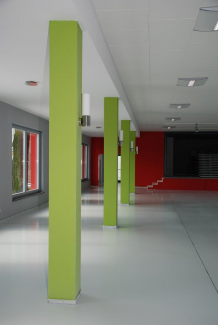 Saal, Bild: Lars-Holger Roos Das Gebäude entstand als Kulturhaus der Gemeinde Großschwabhausen von 1974 bis 1978. Der Zustand - Ergebnis des Leerstandes der letzten Jahre - erforderte einen komplexen Umbau, bei dem die Funktionalität im Vordergrund steht: - repräsentativer Zugang, - übersichtliches Foyer, - gut proportionierter Saal, - mulitifunktionale Bühne mit separatem Zugang, Umkleide und WC, - funktionierender Ausschankbereich, Lager, - neue sanitäre Anlagen, Behinderten-WC. In der Außenwirkung als Blickfang …