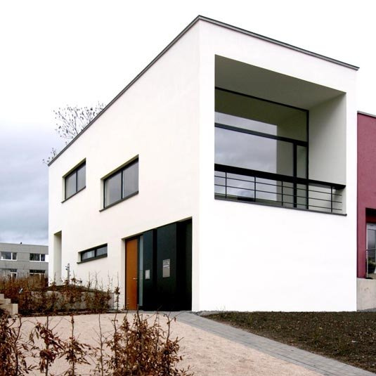Gartenseite, Foto: Strube, Bild: Hartmut Strube In einem unter Denkmalschutz stehenden Villenviertel der Stadt Weimar sollten für drei Bauherren Einfamilienhäuser gebaut werden. Das Baugrundstück war ein vor 100 Jahren stillgelegter Travertinbruch mit 6m hoher Auffüllung und war deshalb trotz der attraktiven Lage bisher noch nicht bebaut. Mit dem Entwurf war beabsichtigt, bei Einhaltung der von den Bauherren vorgegebenen Baukosten, die zwischen ca.250.000 € und 350.000 € für Häuser mit 210 bis 320 m2 Wohnfläche bzw. 260 bis 350 m2 Nutzfläche …