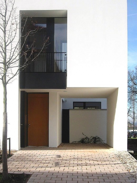 Das Wohnhaus für eine dreiköpfige Familie spiegelt in seiner Architektur klare funktionale Entscheidungen wieder. Gemäß Bebauungsplan teilt es sich in drei Bauteile - Wohnhaus, Eingangsbauteil und Garage, jeweils hervorgehoben durch unterschiedliche Materialwahl - glatter Putz für das Haus, Holzverkleidung für den Windfang, Tür und Zugangssteg, rauher Sichtbeton für die untergeordnete Stellplatzorganisation. Während sich zur Straße (Nord- und Ostseite) eindeutig nur die Haupteingangstür als Zugang …
