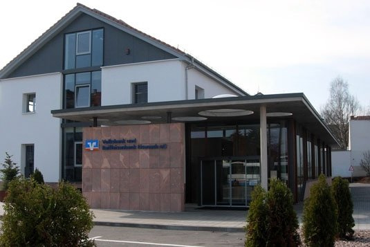 Eingangsfassade, Bild: Michael Heß Am Rande der Eisenacher Innenstadt, in Nähe zum Bahnhof, befindet sich die Volks- und Raiffeisenbank. Das Gebäude aus den 30-er Jahren (ehemaliges Lager- und Warenhaus, 1992 erstmals zur Bank umgenutzt) sollte nun erweitert und nach modernen Kriterien umgestaltet werden. Dazu wurde das Erdgeschoss des Altbaues entkernt, neu geordnet und mit einem neuen riegelförmigen Ausbau aus Sichtbeton und durchgehender Stahl - Glasfassade zu einer funktionellen Einheit zusammengefasst. Im neuen Erdgeschoss …