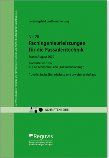 Heft 28 - „Fachingenieurleistungen für die Fassadentechnik“, 4. Auflage, Stand: August 2025, erarbeitet von der AHO-Fachkommission „Fassadenplanung"