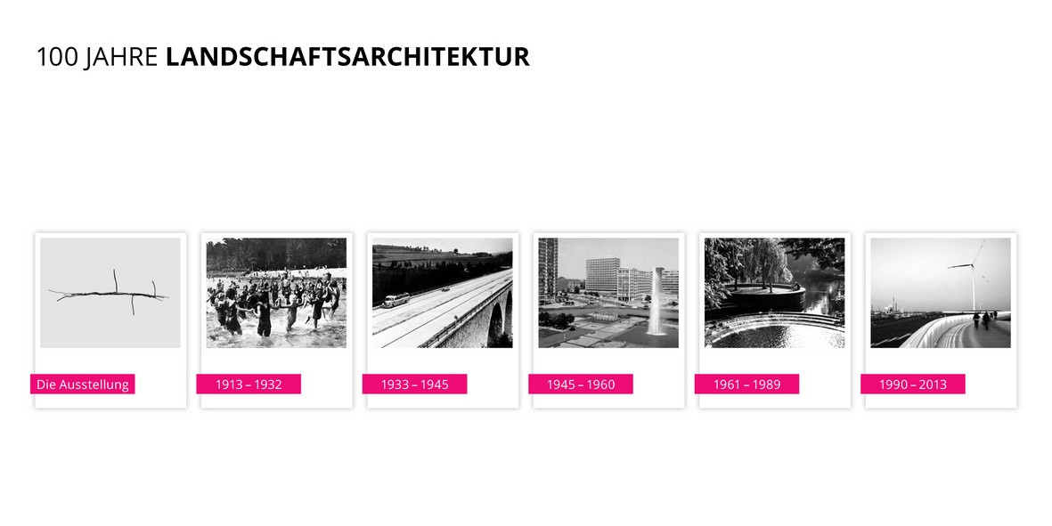 Hier ist der Name Programm: 100-Jahre-Landschaftsarchitektur.de ist eine Online-Ausstellung mit Beispielen aus 100 Jahren geplanter und gebauter Projekte im Freiraum und in der Landschaft. Die Ausstellung ist der letzte Baustein eines umfangreichen Programms anlässlich des 100-jährigen Bestehens des Bundes Deutscher Landschaftsarchitekten im Jahr 2013.