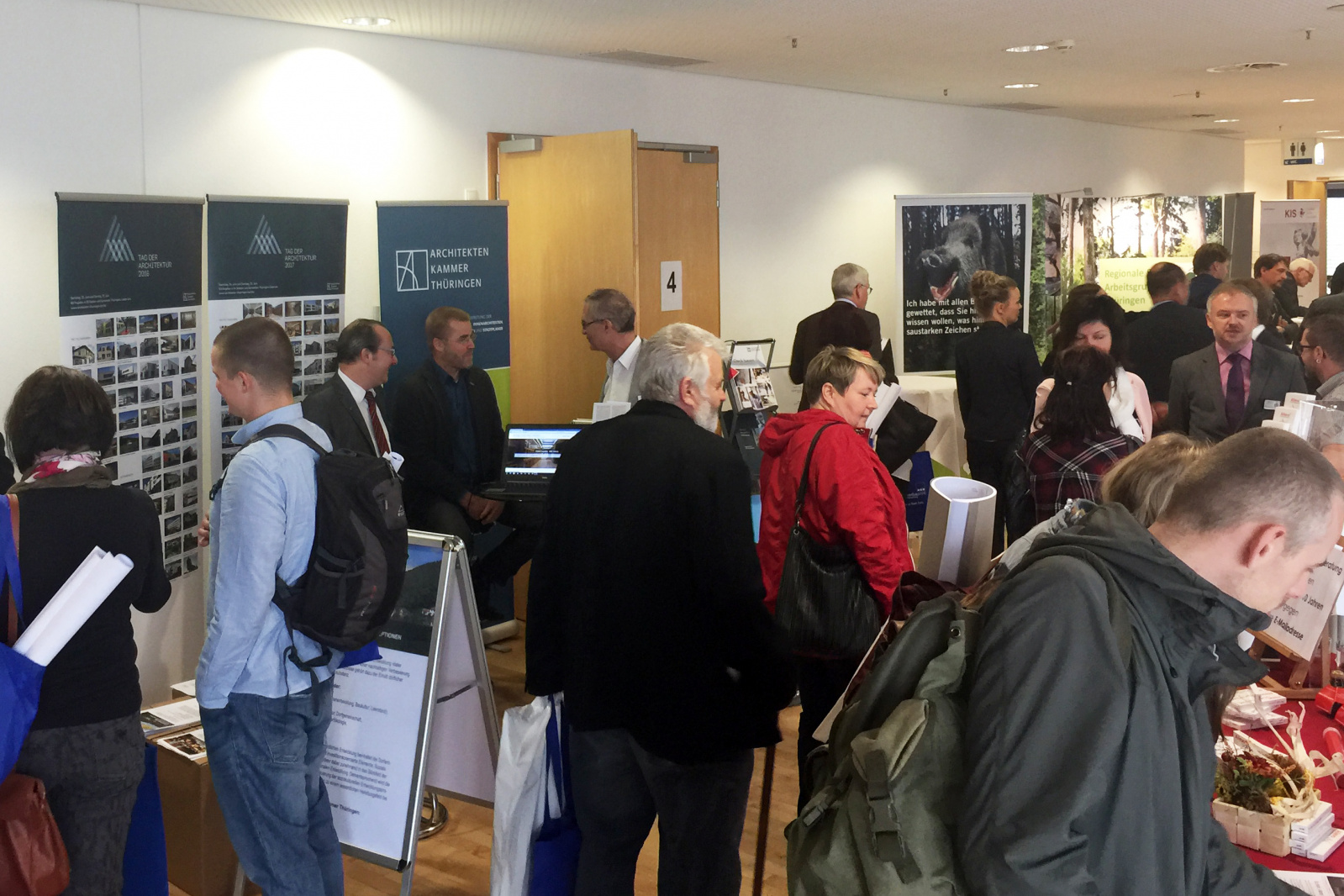 Zur Mitgliederversammlung des Gemeinde- und Städtebundes Thüringen am 25. Oktober 2017 auf der Messe Erfurt präsentierte sich die Architektenkammer Thüringen im Rahmen der begleitenden Informationsbörse erstmals mit einem Stand. Im Mittelpunkt des Auftritts standen Informationen zu den Leistungsangeboten der Kammer und ihrer Mitglieder für den Kommunalbedarf, insbesondere zur Dorfmoderation, zu den Gemeindlichen Entwicklungskonzepten sowie zur Vergabe von Planungsleistungen.