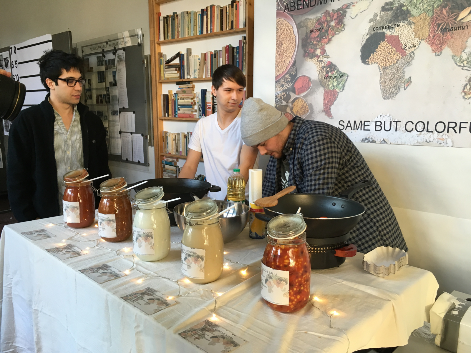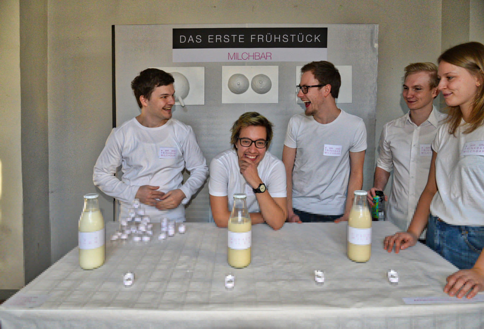 So entwickelte eine Gruppe eine Art Resteverwertungs-App. Im Erdgeschoss gab es eine Wok-Station „Same but colorfull“. Hier wurde jeweils gleiches Gemüse frisch zubereitet und mit Soßen nach Wahl als europäisch, asiatisch, nord- oder südamerikanisch angeboten. Die Jury war satt – und begeistert – noch vor der Preisverleihung. Eine andere Gruppe inszenierte einen gedeckten Tisch, der gleichzeitig leer ist: Nur die Tischdecke konserviert als hinterleuchtetes Relief das, was hier einst war. Kein Tisch, nichts zum Sattwerden, nur Ästhetik. Eine kleine Puppenstube, auch in weiß, zeigt eine klassische Heilig-Abend-Familie mit Weihnachtsbaum und Geschenken beim üppigen Mahl, dahinter laufen im Fernseher live Horror-Nachrichten aus dem syrischen Krieg. Andere setzten dem letzten Abendmahl das „erste Frühstück“ gegenüber und schufen eine Milchbar, wo Milchpulver, Kuhmilch und (vemeintliche) Muttermilch zum Testen angeboten wurden. Bei einer Gruppe verschiedenster Glaubensrichtungen (Christen, Atheisten, Moslems, Hindus) führte die Diskussion in die Tiefen der jeweiligen Liturgien und endete mit dem Titel „… und er brach das Brot – aber welches“ zu einer Brotprobe, bei der verschiedene Brote vom Fladenbrot über Pumpernickel bis zur Oblate gekostet werden konnten. „Die letzte Konsultation“ rückte die Abendmahlinterpretation von Ben Willikens am Abend vor der Projektabgabe in die Hochschule.