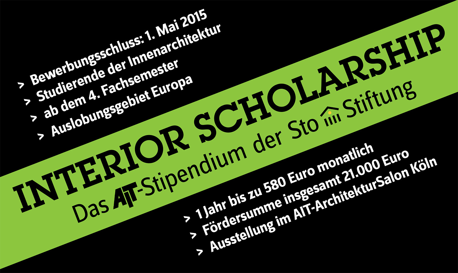Auch 2015 erhalten begabte Studierende der Innenarchitektur ein Jahr lang monatlich bis zu 580 Euro (Fördersumme gesamt: 21.000 Euro) zur Unterstützung ihrer akademischen Ausbildung. Möglich gemacht wird diese europaweite Initiative durch die finanzielle Beihilfe der Sto-Stiftung. Oft erlauben geringe, finanzielle Mittel kein geregeltes Studium, bei dem sich die Studierenden voll auf ihre kreativen Fähigkeiten und innovativen Ideen konzentrieren können. Das Stipendium soll diesen Studierenden Freiräume schaffen und sie wirtschaftlich entlasten.