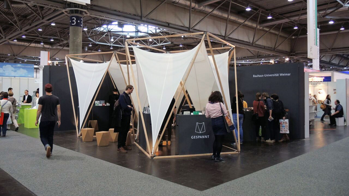 Der Messestand der Architektenkammer besteht aus drei zeltartigen Pavillons und wurde von Studierenden am Lehrstuhl Massivbau II der Bauhaus-Universität Weimar unter Leitung von Prof. Dr.-Ing. Jürgen Ruth und Dipl.-Ing. Torsten Müller entwickelt.