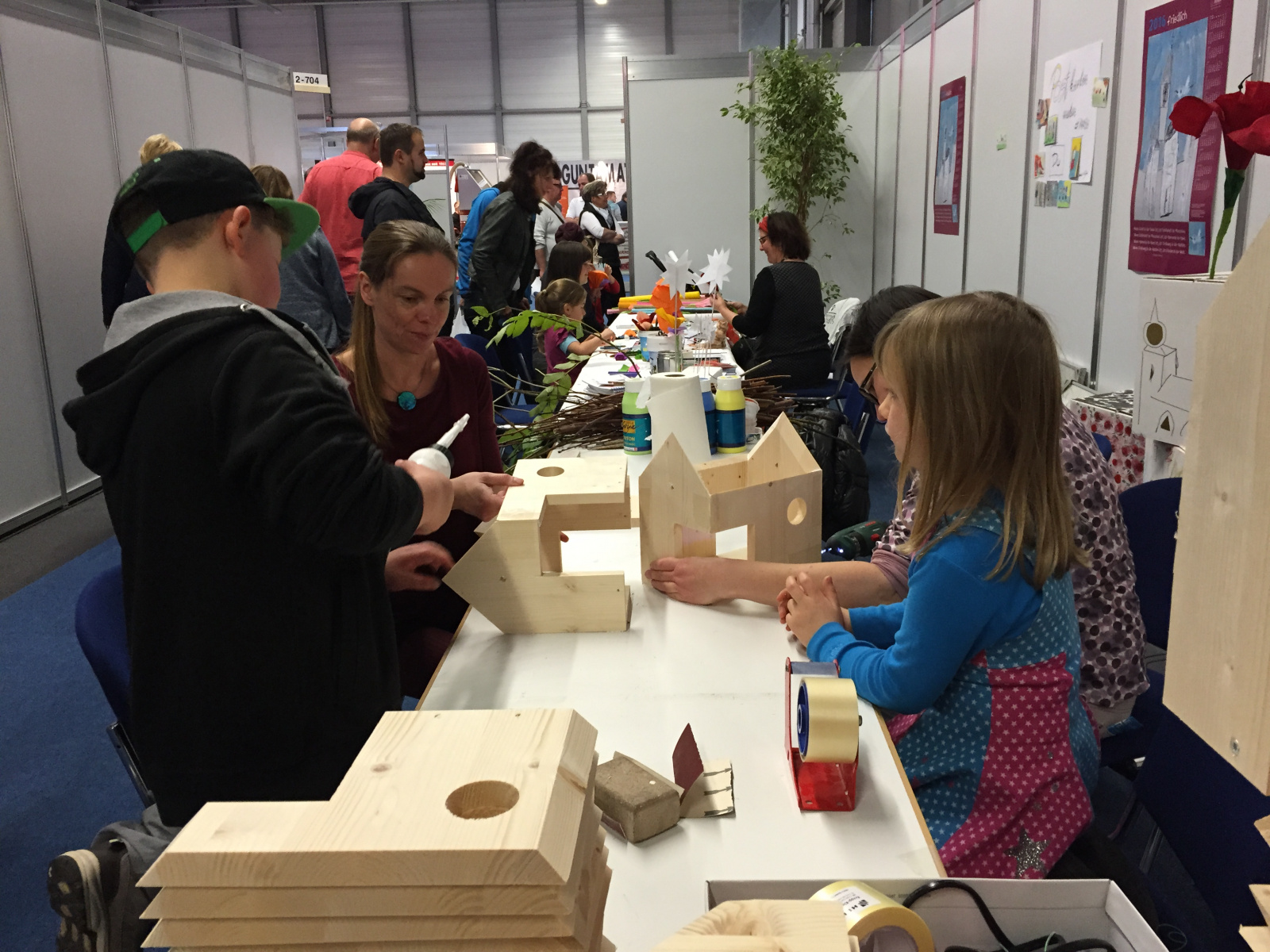 Auf sehr große Nachfrage stieß ein Angebot der AG Architektur und Schule: Unter Anleitung der Architektinnen Katja Huhle und Dana Stiborski sowie unterstützt von Tischler Jens Zöllner hatten kleine Messebesucher die Gelegenheit, „Architekten-Vogelhäuschen“ zu bauen und zu bemalen.