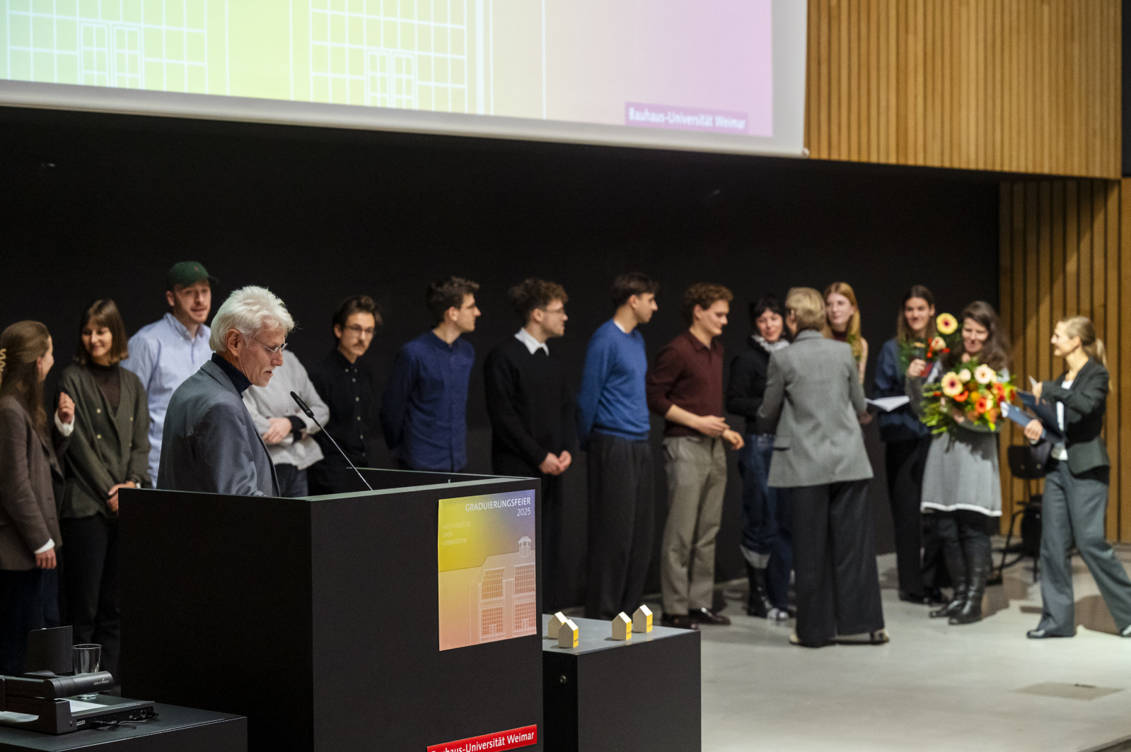 In einem feierlichen Festakt hat die Fakultät Architektur und Urbanistik der Bauhaus-Universität Weimar am 21. November 2025 rund 170 Absolvent*innen verabschiedet. Im Rahmen der Graduierungsfeier wurden auch in diesem Jahr Preise und Anerkennungen für herausragende Abschlussarbeiten vergeben. Die Ausstellung der prämierten und nominierten Projekte ist noch bis zum 18. Dezember 2025 im Hauptgebäude der Bauhaus-Universität Weimar zu sehen.