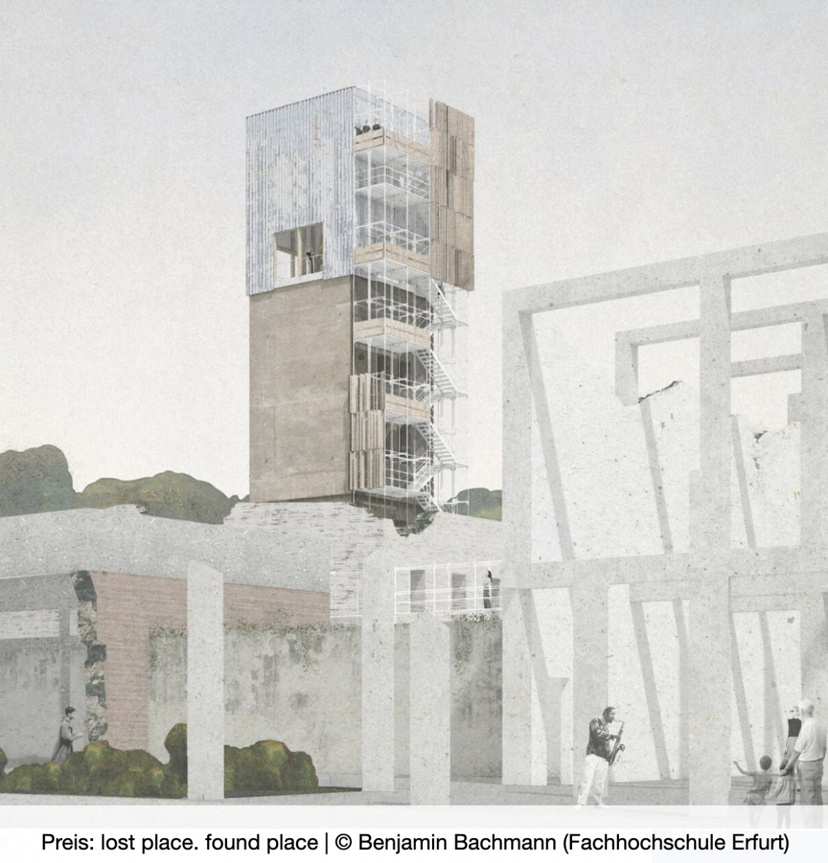 Wir freuen uns besonders, dass die an der FHE entstandene Bachelorarbeit „lost place. found place“ beim „Studienpreis Konrad Wachsmann 2024“ erfolgreich war. Für seine selbstgestellte Bachelorarbeit – die Umgestaltung eines Teilgebietes des Alten Schlachthofs in Erfurt – erhielt B.Sc. Benjamin Bachmann einen der drei Preise. Begleitet wurde die Arbeit durch Prof. Florian van het Hekke.