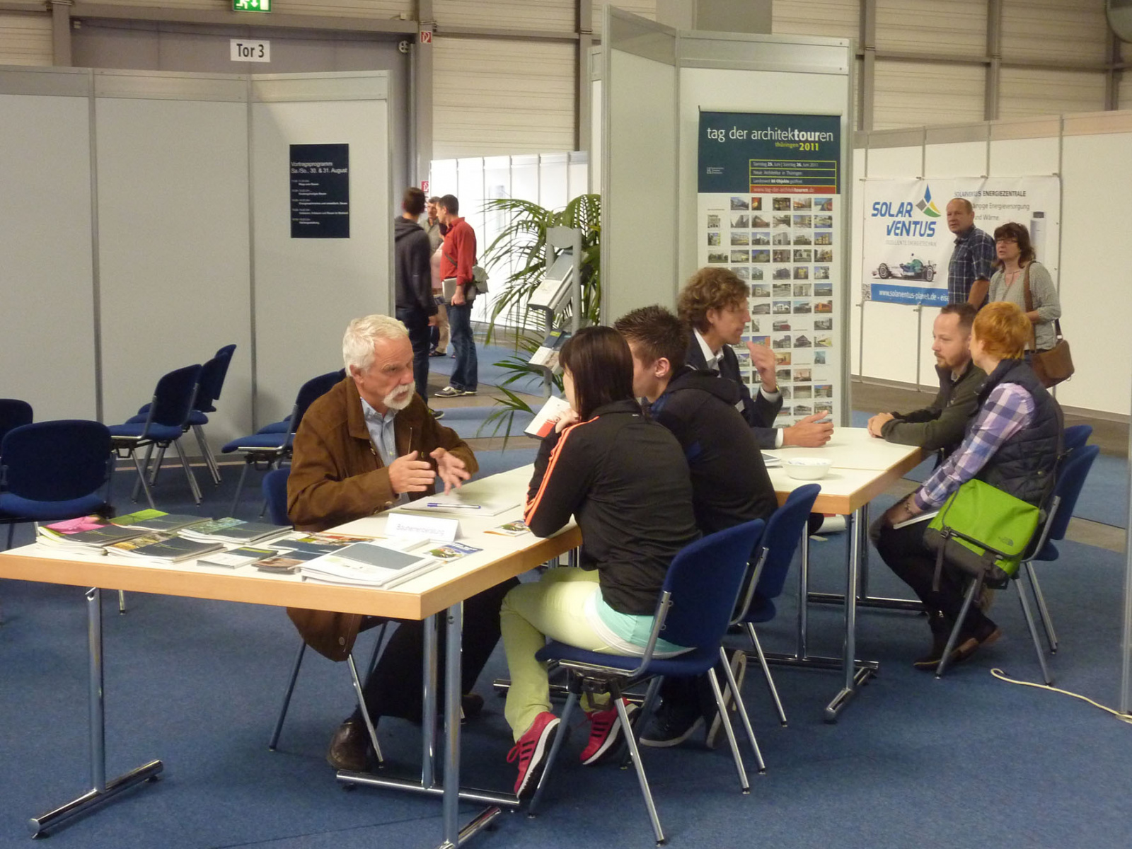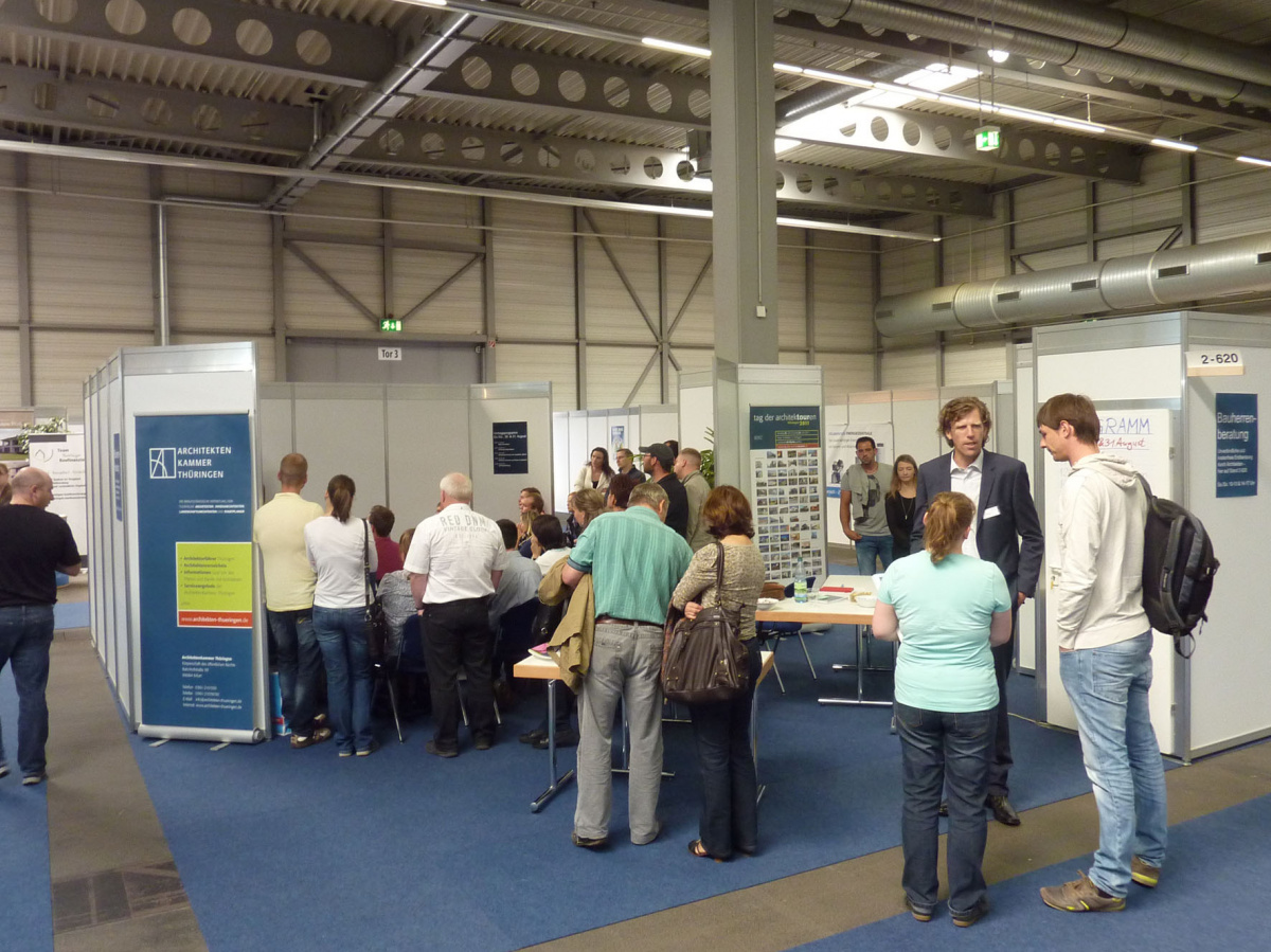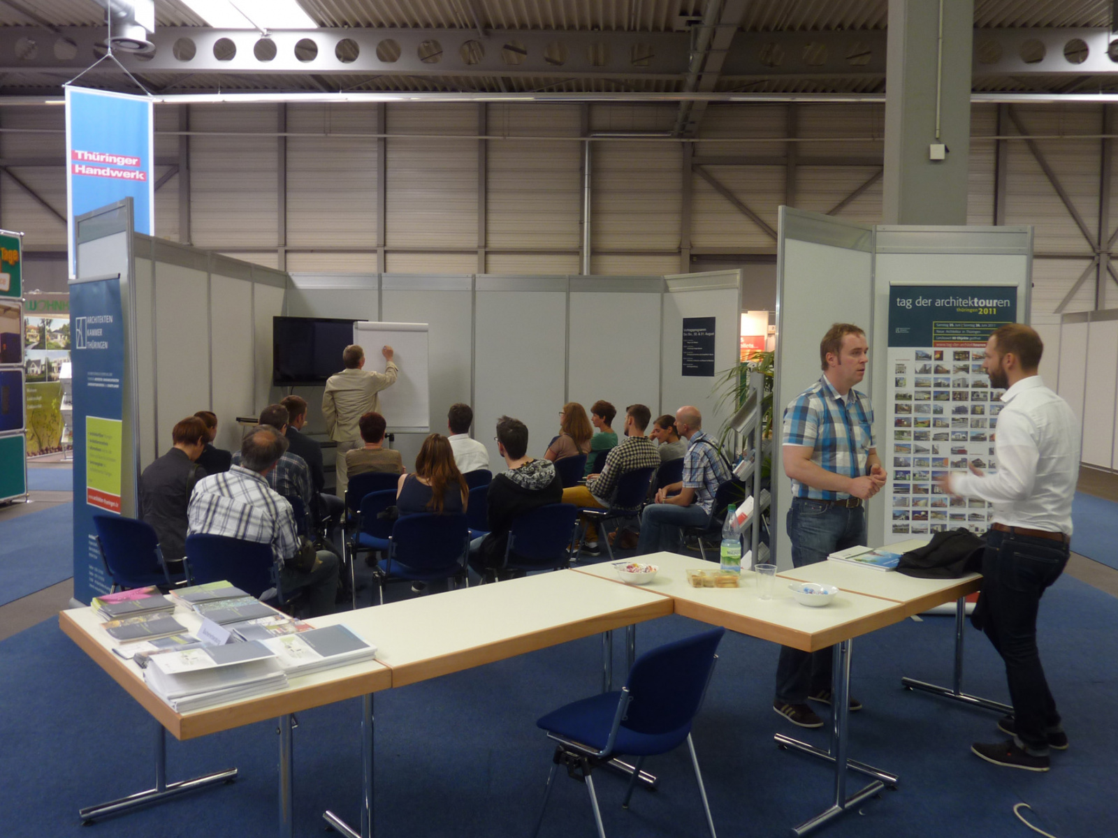 Zu den rund einhundert Ausstellern gehörte auch die Architektenkammer Thüringen, die in diesem Jahr auf einem 56 Quadratmeter großen Stand sowohl Erstberatungen als auch Fachvorträge in einem eigens eingerichteten Forum anbot. Interessenten erhielten in zwanzigminütigen Impulsreferaten durch Architekten und Landschaftsarchitekten fundierte Einblicke zu den Themen Hausbau, Umbau, zum kostengünstigen, zum energieoptimierten und umweltschonenden Bauen sowie zur Gartengestaltung.
