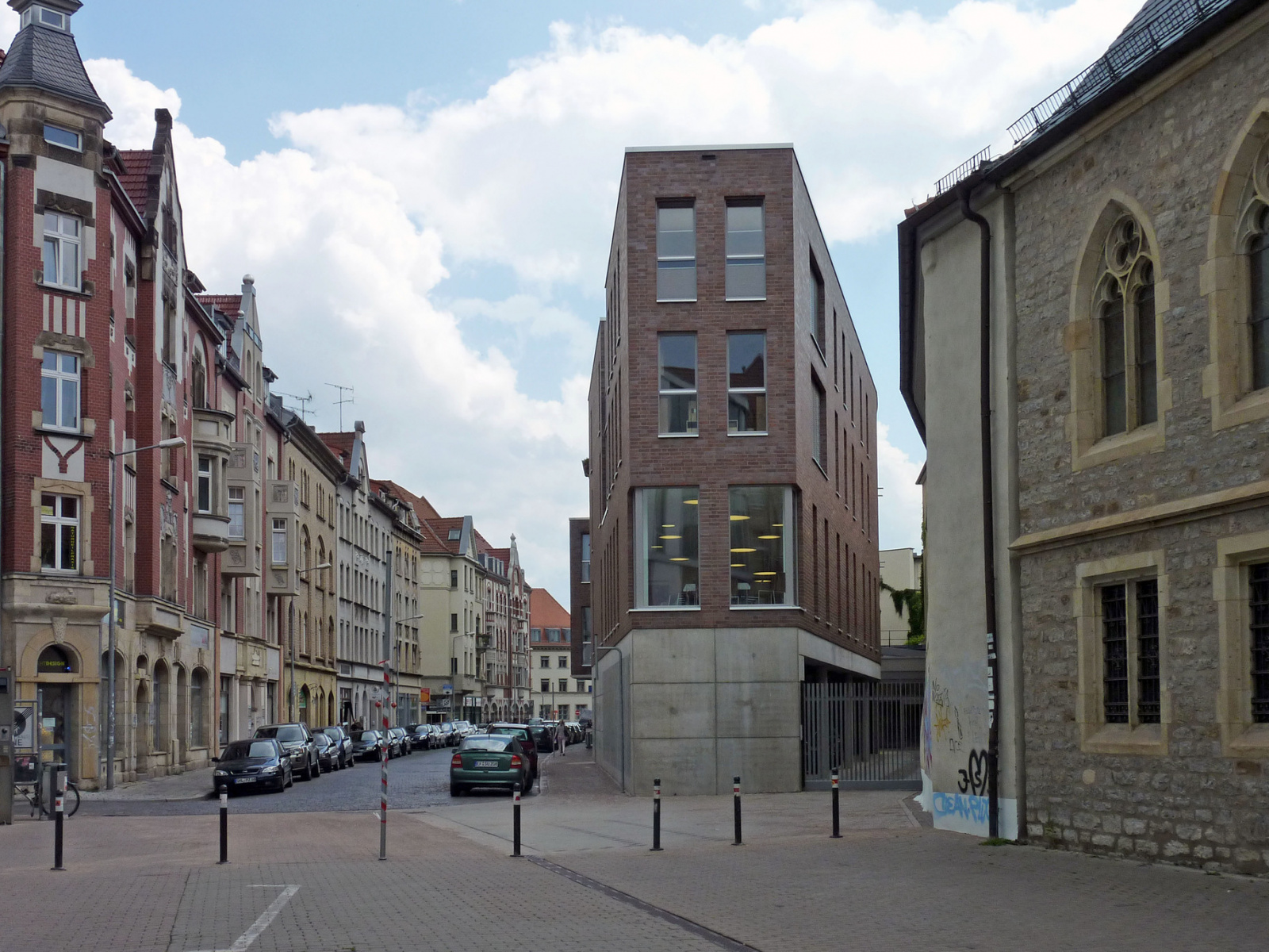 In der Trommsdorffstraße in Erfurt, fast am Anger mit seinen Geschäftsbauten, bestand die Herausforderung darin, auf einem schmalen, keilförmigen Grundstück ein Bildungshaus und Wohnungen unterzubringen. Ein 40 Meter langer Baukörper entwickelt sich zwischen der Straßenflucht und der rückseitigen Brandwand, spitzt sich zum Anger hin bis auf drei Meter Gebäudetiefe zu. Der Neubau mit seinem erdgeschossigen Sichtbetonsockel und den darüber liegenden klinkerbekleideten Obergeschossen nimmt Bezug auf die umgebende Bebauung und schafft mit eingezogenen Loggien ein Wechselspiel zum Rhythmus seiner vertikal betonten Fenster … Der Neubau fügt sich zeitgemäß und selbstbewusst in seine Umgebung ein, ohne dominant zu werden und ergänzt damit wie selbstverständlich ein Stück Stadt in einer nicht einfach handhabbaren Lage.