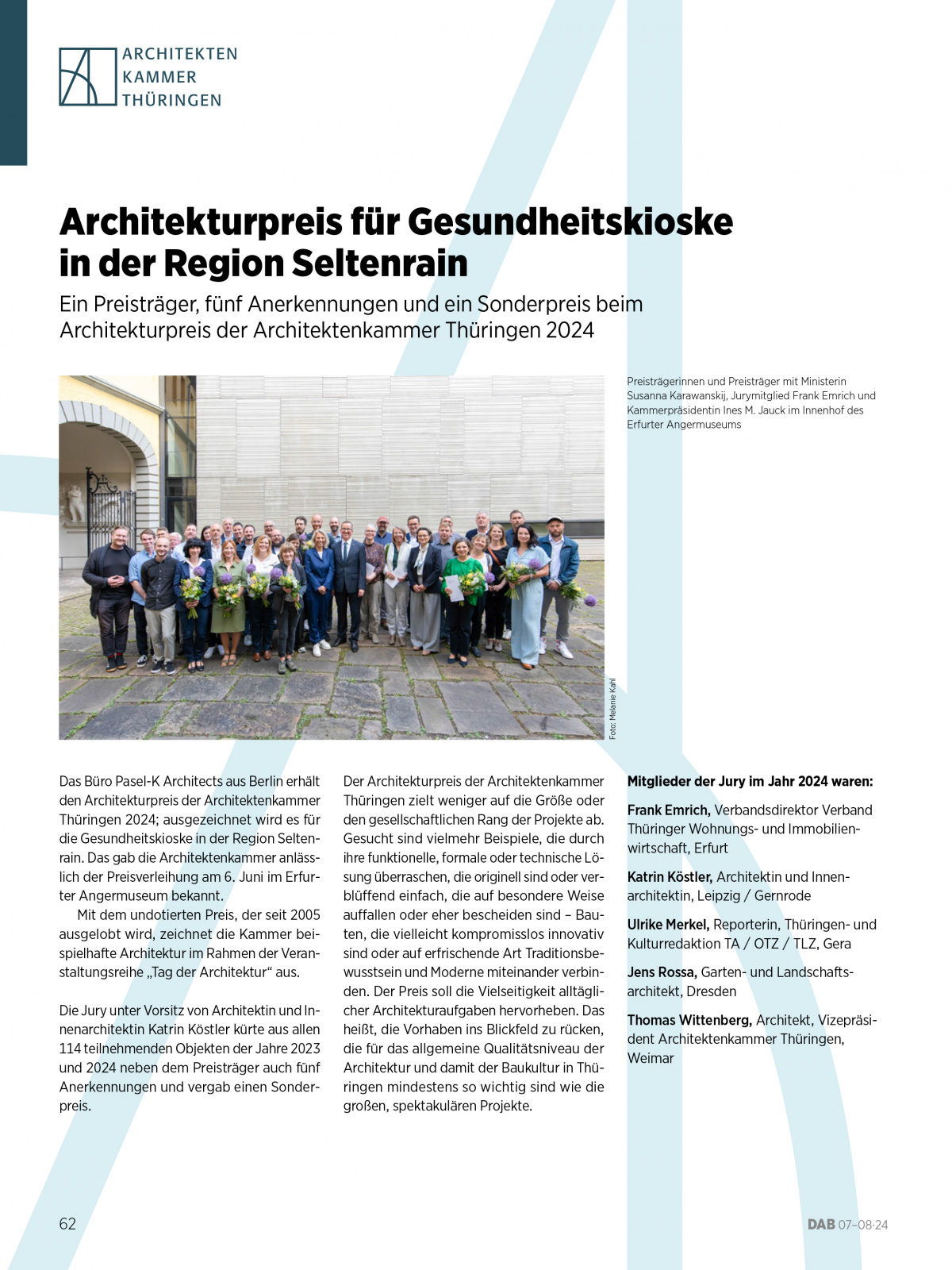 - Seite 67: Mitteldeutscher Architekt*innentag am 25. Oktober 2024 in Apolda – Anmeldungen ab sofort möglich; Otto-Borst-Preis für Stadterneuerung 2024 verliehen – Junk & Reich Architekten BDA erhält Anerkennung