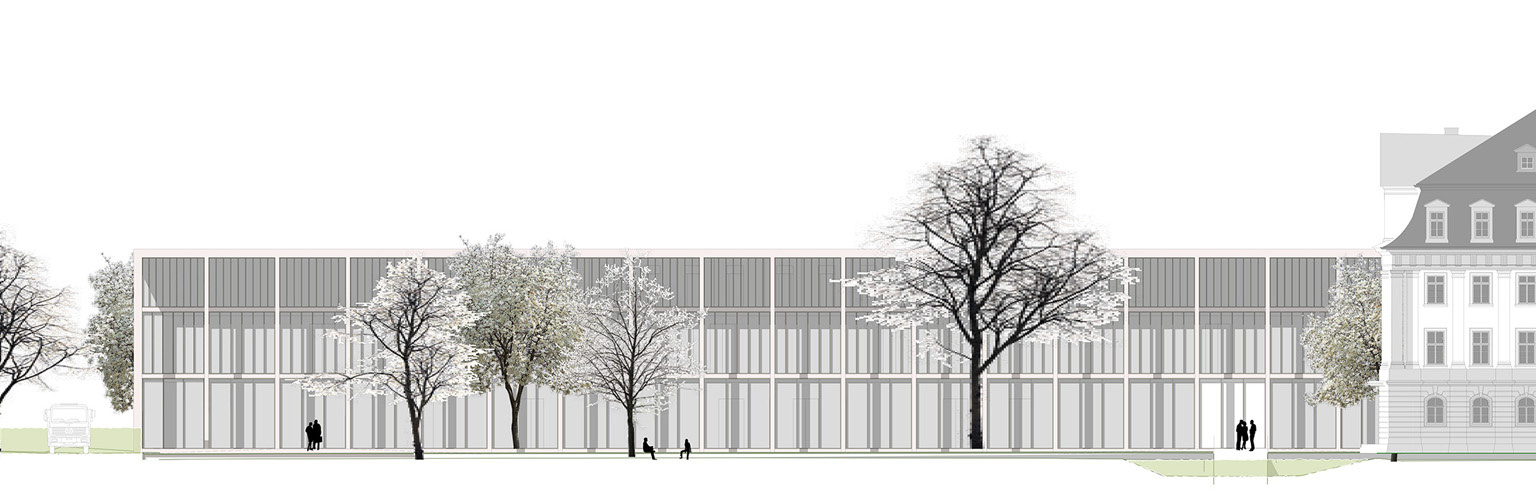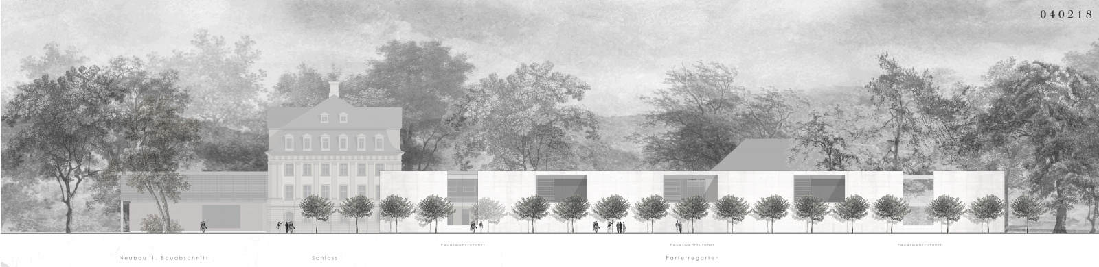 Die Arbeit schlägt eine präzise, städtebaulich überzeugende Fortschreibung des bestehenden Ensembles vor. Die städtebauliche Setzung folgt der Körnung des Bestandes und ergänzt diese auf der Westseite des Schlosses selbstverständlich. Die Feingliedrigkeit der Baukörper setzt sich in der Grundrissgestaltung fort. Die Baumasse wird konzentriert auf zwei Geschosse verteilt. Durch eine disziplinierte Gliederung der Grundrisse entsteht die gewollte Typologie des Gebäudes. Diese bildet sich auch in den umlaufenden Fassaden ab. Hervorzuheben ist das Ansinnen, die gestalterischen Motive des Bestandes mit eigenen Akzenten fortzuschreiben und somit das Ensemble zu komplettieren. Das Schloss bleibt dabei als Mittelpunkt der Anlage deutlich sichtbar. Die vier Kuben spielen in Anlehnung an die vorhandenen Ergänzungsbauten in Richtung Osten bewusst mit der leichten Überlagerung des landschaftsarchitektonisch nachempfundenen ehemaligen Wasserbeckens. Von der Westseite eingeschobene Höfe ermöglichen eine effiziente, zweihüftige Anlage und lösen die schallschutz- und belichtungstechnischen Problemstellungen des Standortes. Hierbei werden die Hörsäle im Bereich der Siemensstraße zu den Höfen orientiert und gut belichtet. Die Haupterschließung in der nordöstlichen und die Anlieferung in der südöstlichen Fuge folgen der Logik des Bestandes. Im Inneren entstehen gut mit Tageslicht versorgte Raumfolgen. Die brückenartigen Verbindungsfugen nehmen die Lernnischen auf und ermöglichen das zurückgezogene Lernen entlang der Gartenhöfe. Die gewählte Konstruktion und Tragstruktur lässt eine wirtschaftliche Errichtung der Baukörper erwarten. Gegebenenfalls zu großzügig gewählte Verglasungen in der 2. Ebene in Richtung Osten werden nutzerseitig kritisch gesehen.