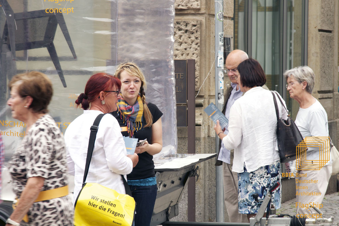Die Tour führte von belebten Plätzen in Erfurts Innenstadt zu interessanten Architekturprojekten, welche anlässlich des zeitgleich stattfindenden Tags der Architektur besichtigt werden konnten. „Wir haben viele Menschen erreicht und konnten mit unserer Aktion gut auf uns und unsere Arbeit aufmerksam machen“, resümiert Hedi Kappler, Innenarchitektin aus Jena. Auf Flyern und Postkarten stellten die InnenarchitektInnen ihre Projekte und die Arbeit im BDIA vor. Besucher konnten besonders im persönlichen Gespräch Einblicke in die Arbeitsweisen bekommen.