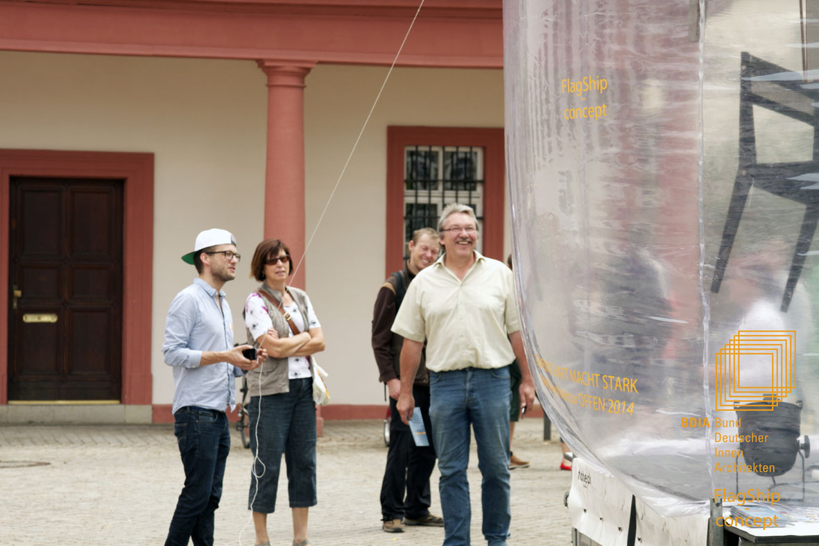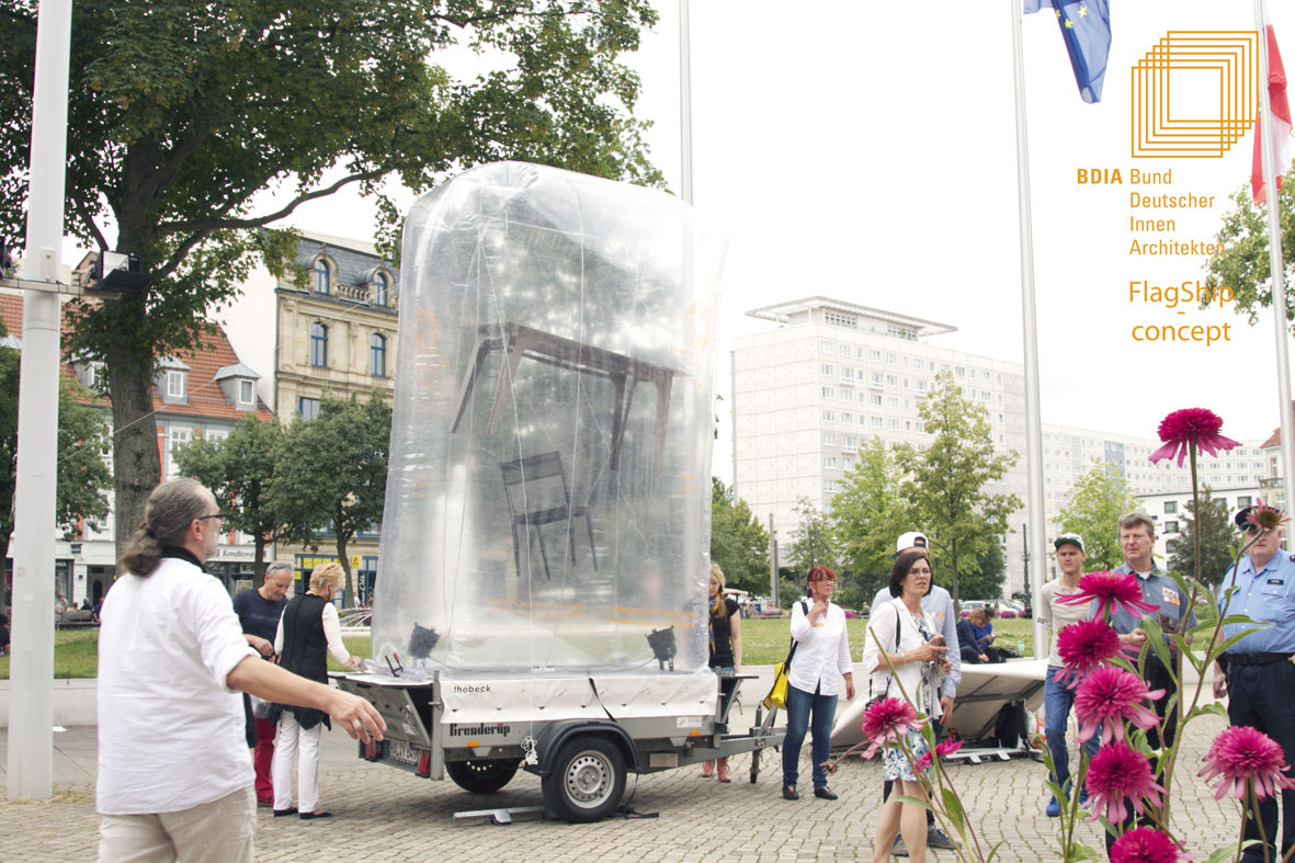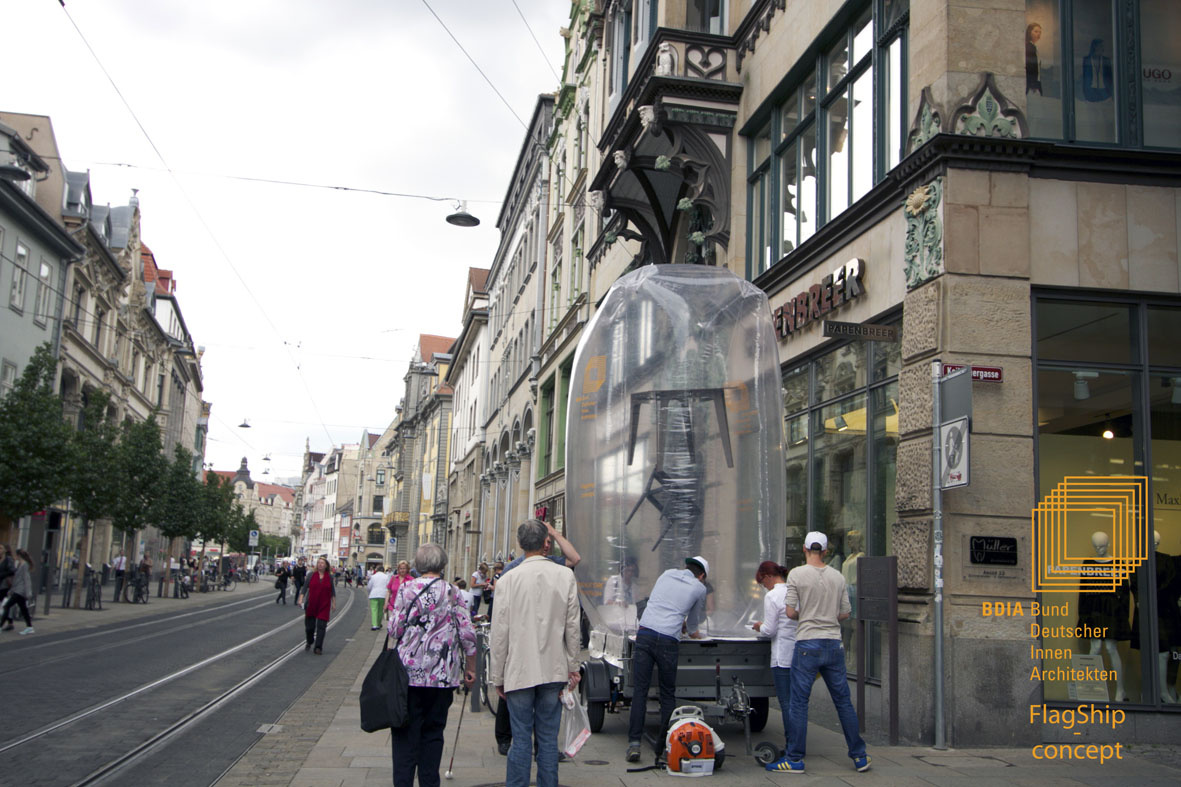 „Flagship-Concept“ ist ein von den beiden Designern als mobiler Messestand konzipierter Raum, den der BDIA Thüringen zu einem aufmerksamkeitswirksamen Informationsstand umfunktionierte. In minutenschnelle kann dieser Infopoint mit Luft gefüllt und wieder demontiert werden; „so konnten wir unseren Standort flexibel wechseln und an vielen Hotspots in Erfurt und Jena präsent sein“, erklärt Theo Möller, Designer aus Halle an der Saale.
