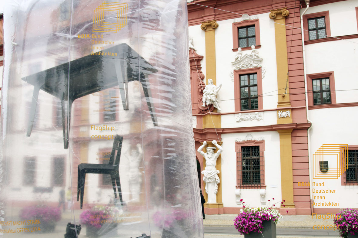Ein vier Meter hoher Raum, aus Folie geschweißt und mit Luft gefüllt, darin hängend zwei innovative, weil ultraleichte Möbel – Tisch Eins von Thomas Beck und Stuhl 01 von Theo Möller. Mit diesem mobilen Raumkonzept sorgten die InnenarchitektInnen des BDIA Thüringen in den Innenstädten von Erfurt und Jena für ordentlich Aufsehen. Unter dem Motto „Gemeinschaft macht STARK“ präsentierten sich Jens Thasler, Frieder Kreß, Kathrin Meisel, Hedi Kappler, Kathrin Römhild-Sachrau, Jutta Kehr und Anne Schliez gemeinsam mit den Jungdesignern Thomas und Theo einer aufgeschlossenen Öffentlichkeit.