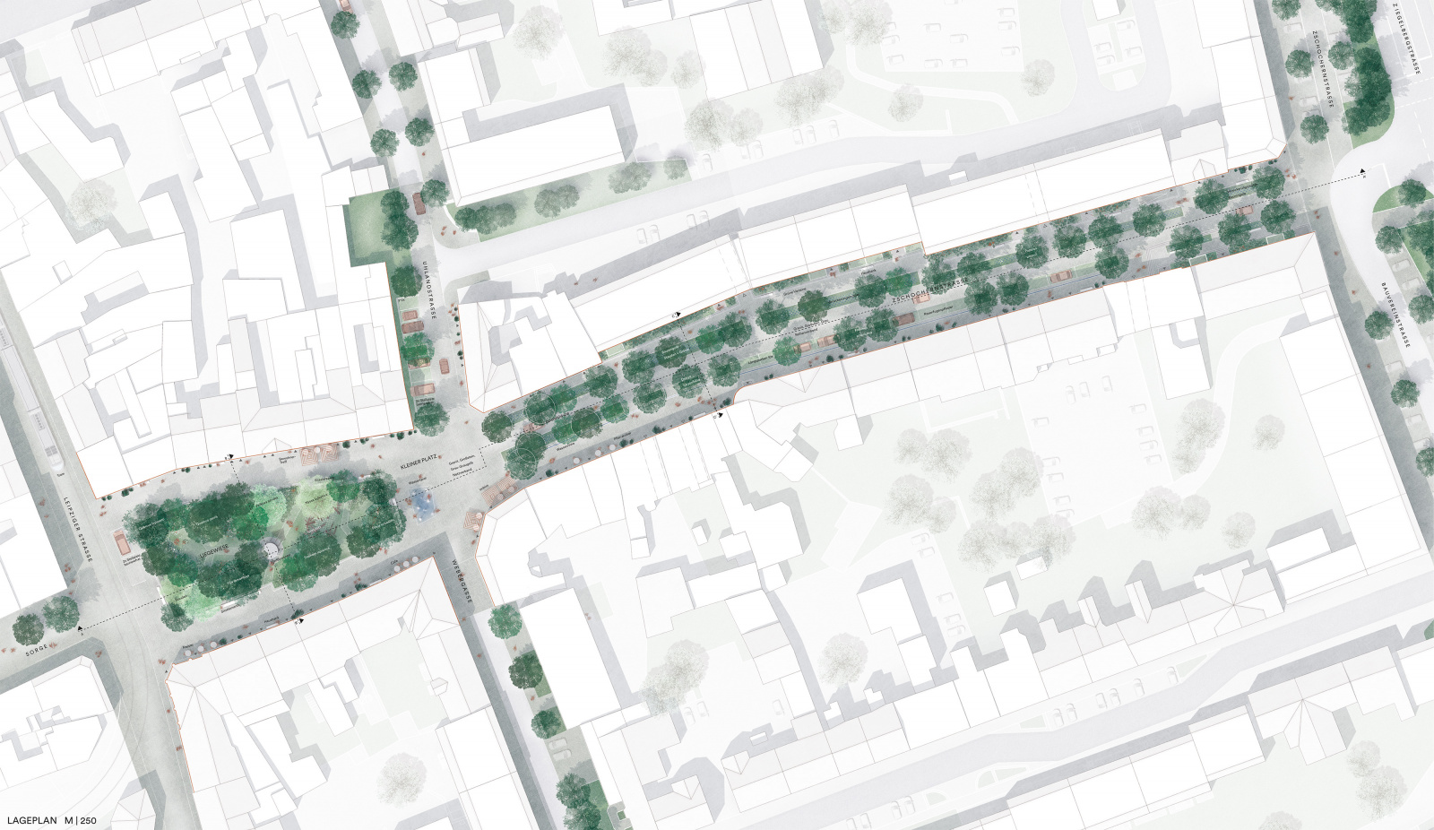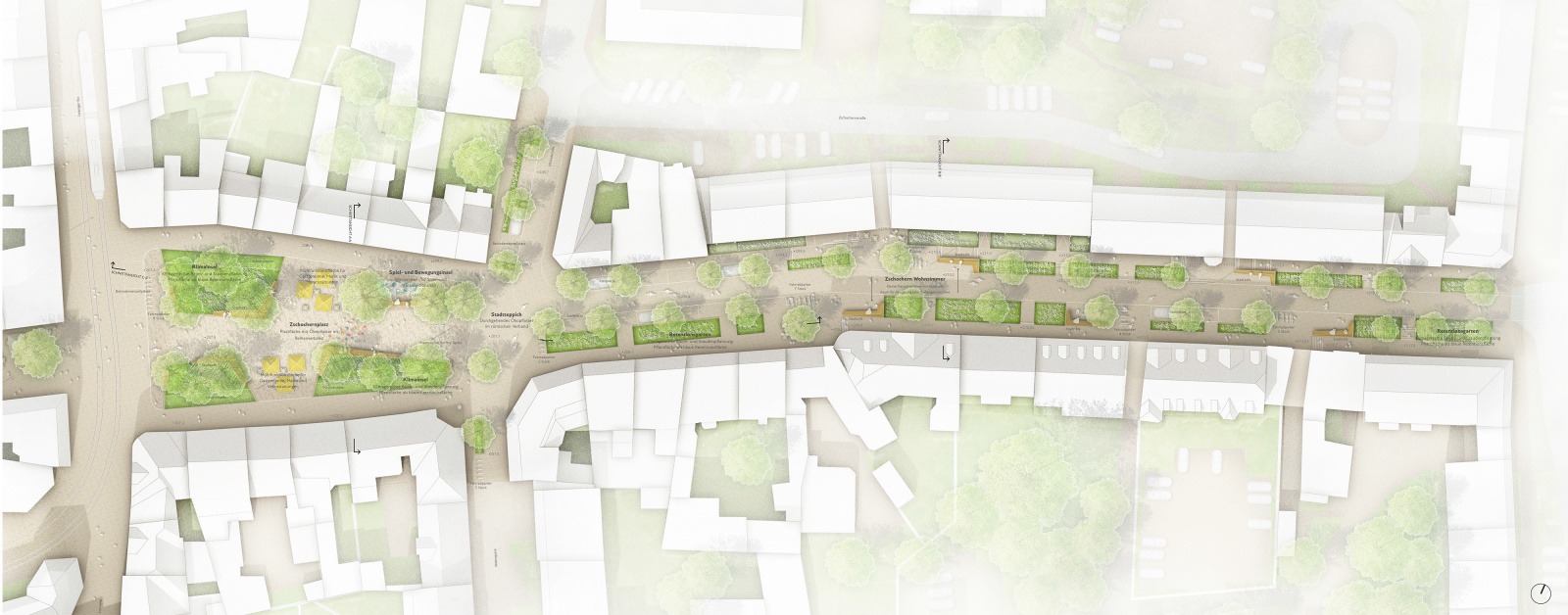 Der Straßenraum wird mit der zentralen Fahrspur und der Anordnung der Beete linear geprägt, wirkt jedoch durch Aufweitungen in den Aufenthaltsbereichen nicht monoton. Am östlichen Übergang zur Bauvereinstraße wird zum Umgang mit dem anschließenden destrukturierten Raum keine Aussage getroffen.