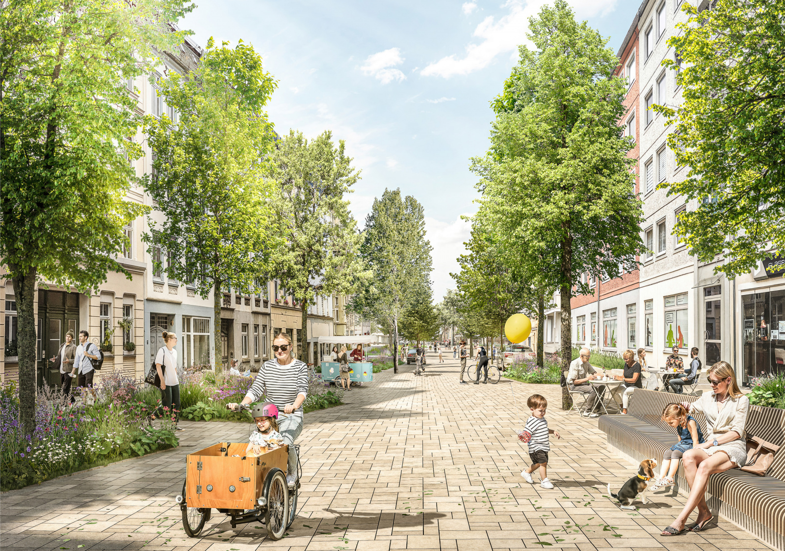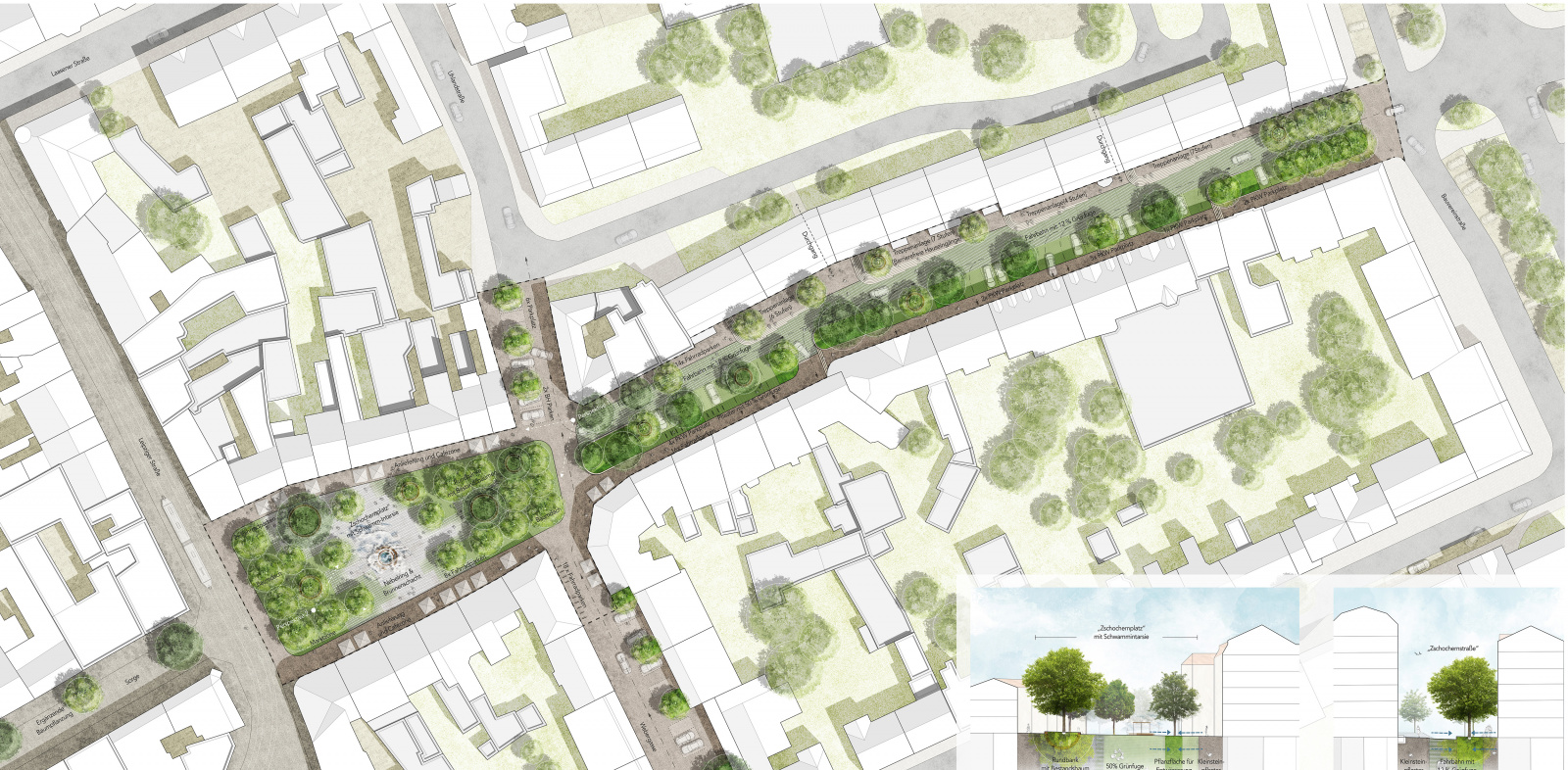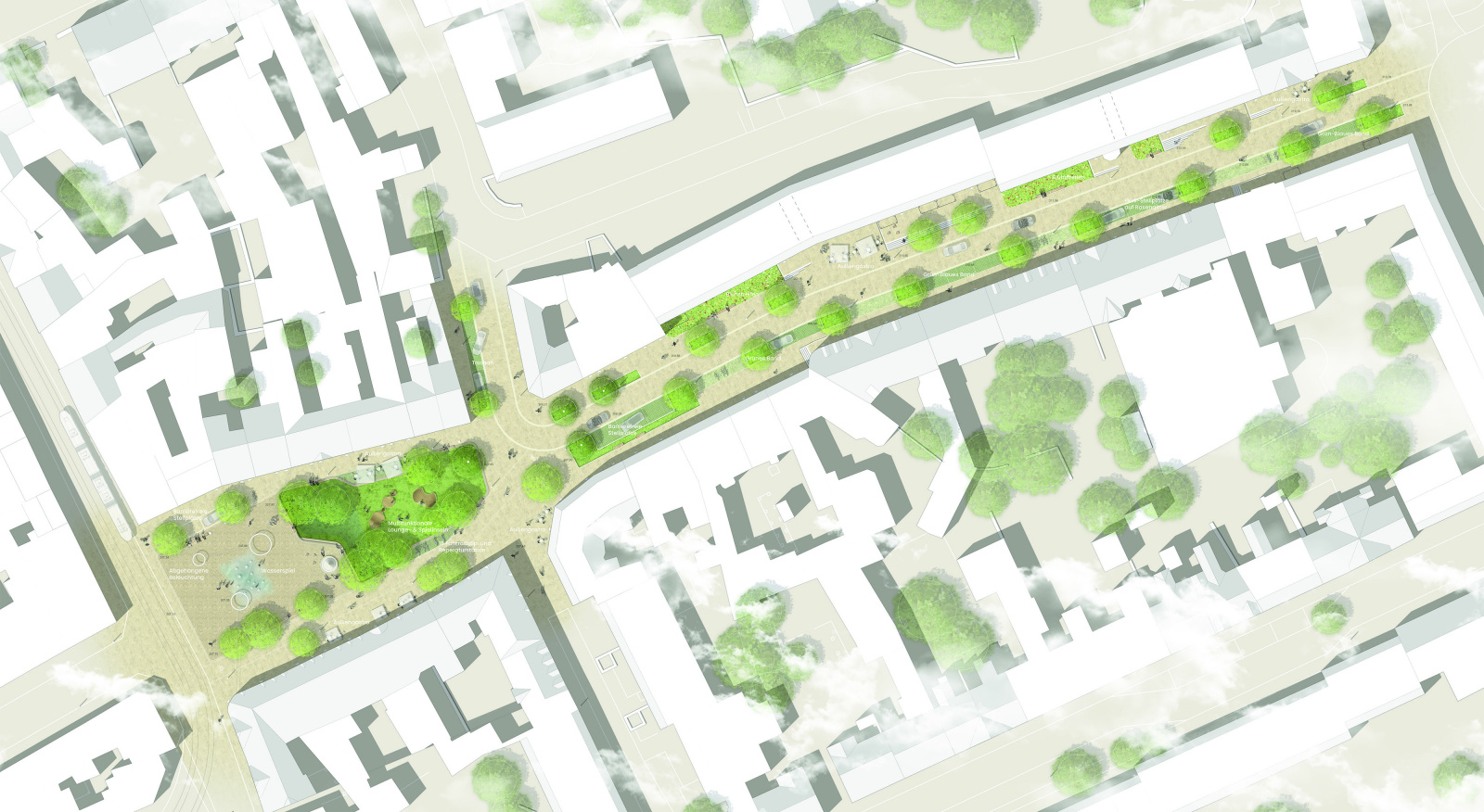 Im Straßenraum kann die Arbeit durch einen hohen Grünanteil, wiederum als so genannte Klimabeete ausgebildet, bei gleichzeitiger Funktionalität im Bezug auf die Verkehrsführung und Höhenausbildung überzeugen.